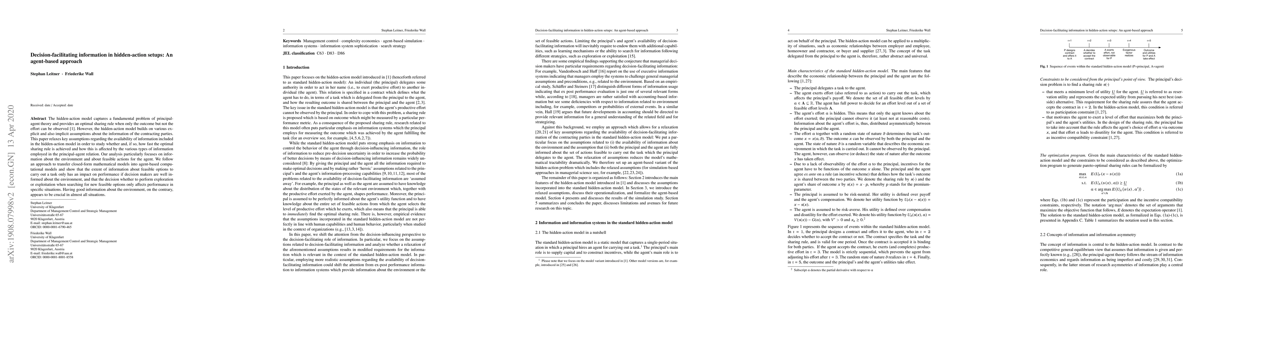 The hidden-action model captures a fundamental problem of principal-agent theory and provides an optimal sharing rule when only the outcome but not the effort can be observed. However, the hidden-action model builds on various explicit and also implicit assumptions about the information of the contracting parties. This paper relaxes key assumptions regarding the availability of information included in the hidden-action model in order to study whether and, if so, how fast the optimal sharing rule is achieved and how this is affected by the various types of information employed in the principal-agent relation. Our analysis particularly focuses on information about the environment and about feasible actions for the agent. We follow an approach to transfer closed-form mathematical models into agent-based computational models and show that the extent of information about feasible options to carry out a task only has an impact on performance if decision makers are well informed about the environment, and that the decision whether to perform exploration or exploitation when searching for new feasible options only affects performance in specific situations. Having good information about the environment, on the contrary, appears to be crucial in almost all situations.