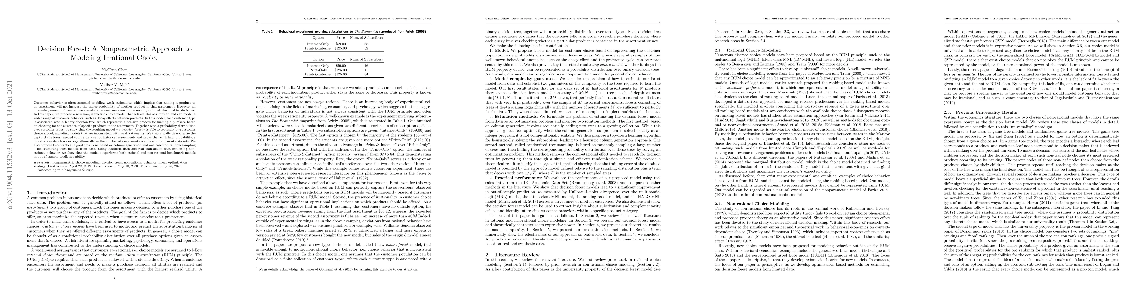 This paper introduces a nonparametric "decision forest" model to capture irrational customer choices, using binary decision trees to represent individual decision processes. It outperforms traditional rational models in predicting non-rational behavior, as demonstrated through synthetic and real-world data.