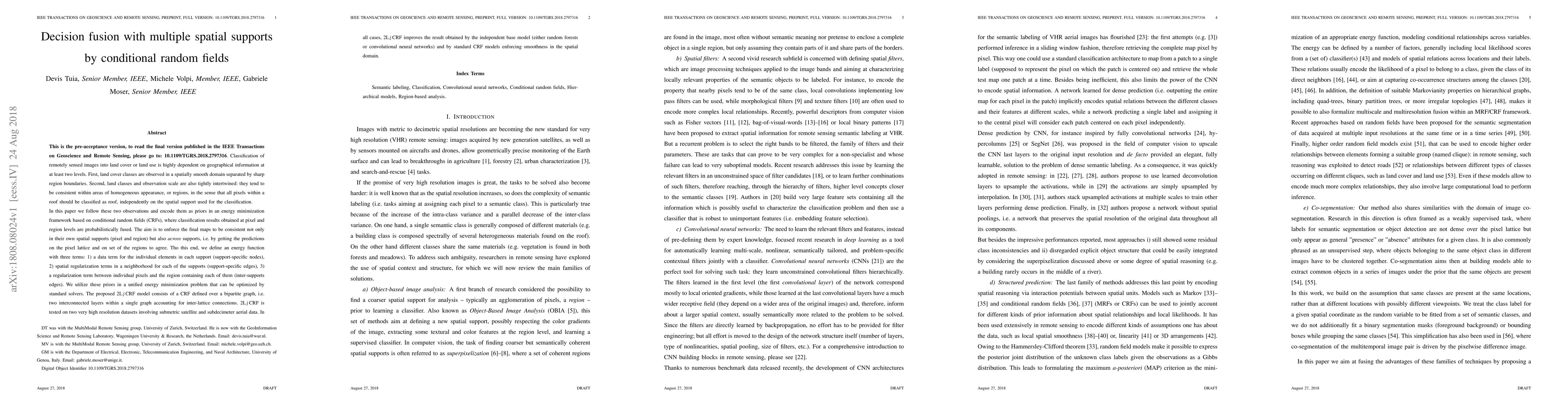 Classification of remotely sensed images into land cover or land use is highly dependent on geographical information at least at two levels. First, land cover classes are observed in a spatially smooth domain separated by sharp region boundaries. Second, land classes and observation scale are also tightly intertwined: they tend to be consistent within areas of homogeneous appearance, or regions, in the sense that all pixels within a roof should be classified as roof, independently on the spatial support used for the classification. In this paper, we follow these two observations and encode them as priors in an energy minimization framework based on conditional random fields (CRFs), where classification results obtained at pixel and region levels are probabilistically fused. The aim is to enforce the final maps to be consistent not only in their own spatial supports (pixel and region) but also across supports, i.e., by getting the predictions on the pixel lattice and on the set of regions to agree. To this end, we define an energy function with three terms: 1) a data term for the individual elements in each support (support-specific nodes); 2) spatial regularization terms in a neighborhood for each of the supports (support-specific edges); and 3) a regularization term between individual pixels and the region containing each of them (intersupports edges). We utilize these priors in a unified energy minimization problem that can be optimized by standard solvers. The proposed 2LCRF model consists of a CRF defined over a bipartite graph, i.e., two interconnected layers within a single graph accounting for interlattice connections.