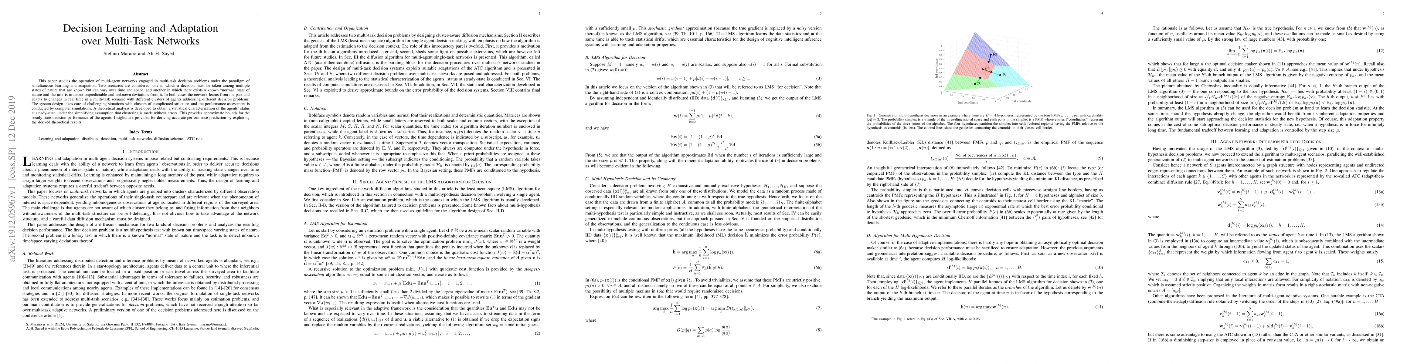 This paper explores multi-agent networks solving multi-task decision problems through simultaneous learning and adaptation, addressing scenarios with both predictable and unpredictable changes. Theoretical analysis and simulations provide insights into steady-state performance and decision accuracy under clustering assumptions.