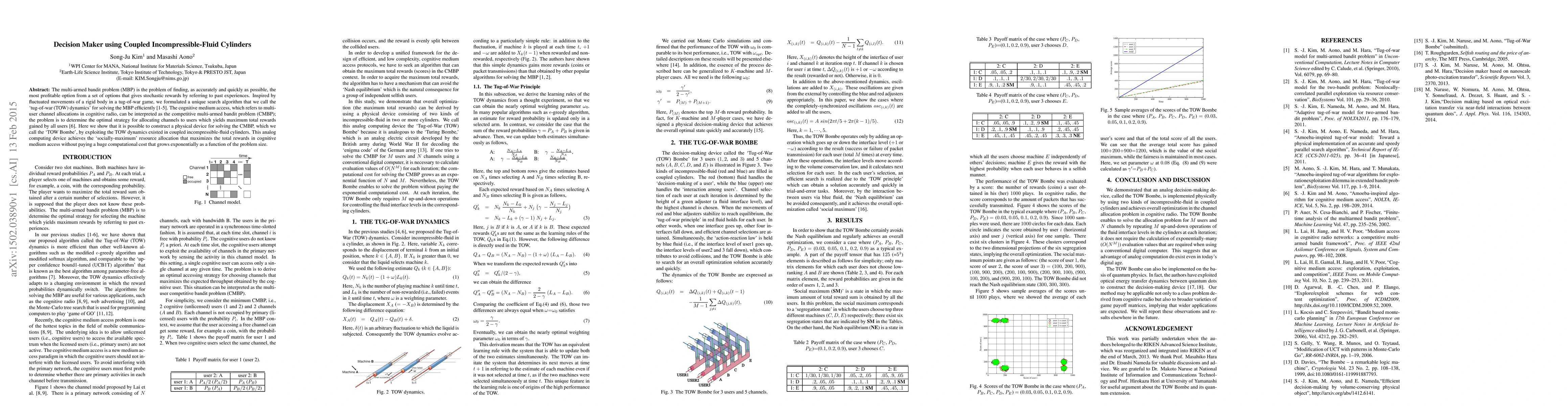 Tug-of-War Bombe is an analog decision-making device that solves the channel allocation problem in cognitiveradio using volume-conserving physical object