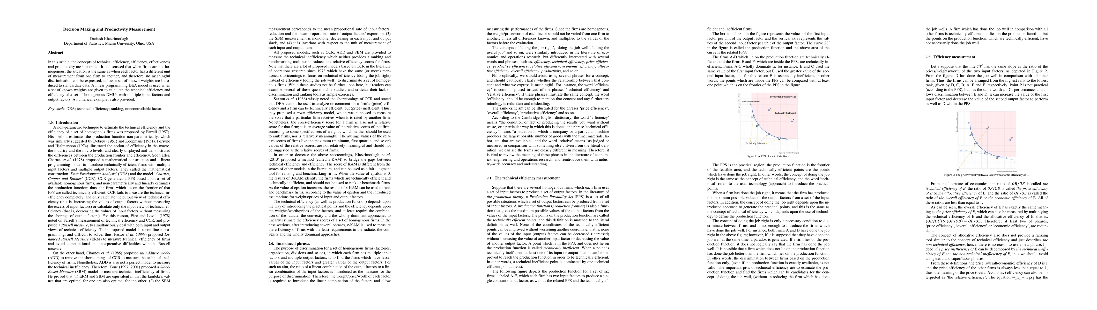 In this article, the concepts of technical efficiency, efficiency, effectiveness and productivity are illustrated. It is discussed that when firms are not homogenous, the situation is the same as when each factor has a different unit of measurement from one firm to another, and there-fore, no meaningful discrimination can be expressed, unless a set of known weights are introduced to standardize data. A linear programming DEA model is used when a set of known weights are given to calculate the technical efficiency and efficiency of a set of homogenous DMUs with multiple input factors and output factors. A numerical example is also provided.