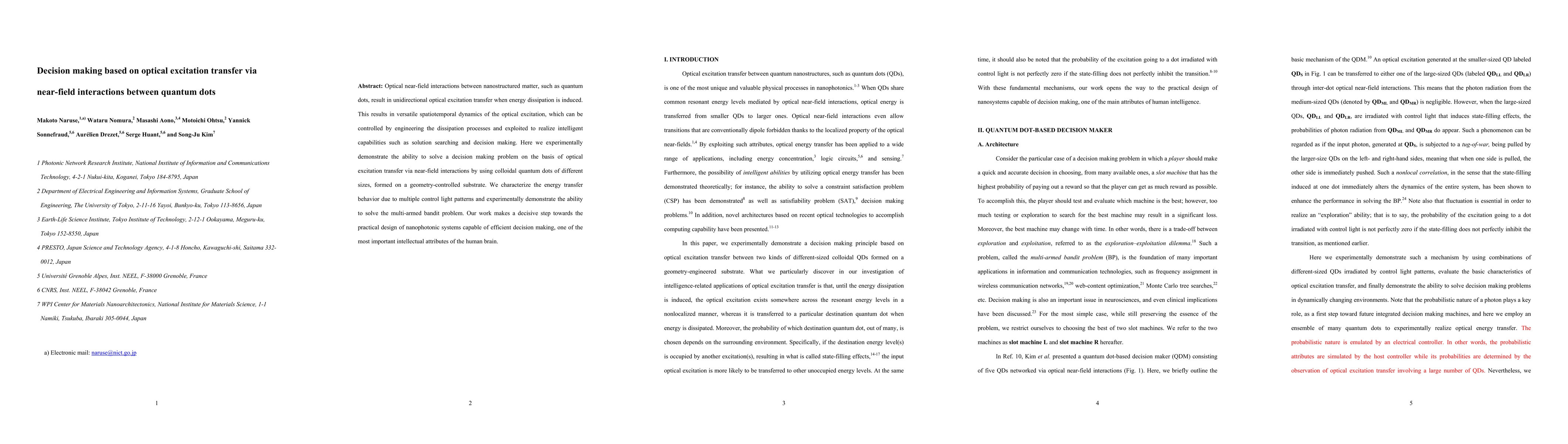 This paper demonstrates a decision-making system based on optical excitation transfer via near-field interactions between quantum dots, showing the ability to solve the multi-armed bandit problem. The research highlights the potential for nanophotonic systems to perform intelligent decision making by controlling energy dissipation processes.