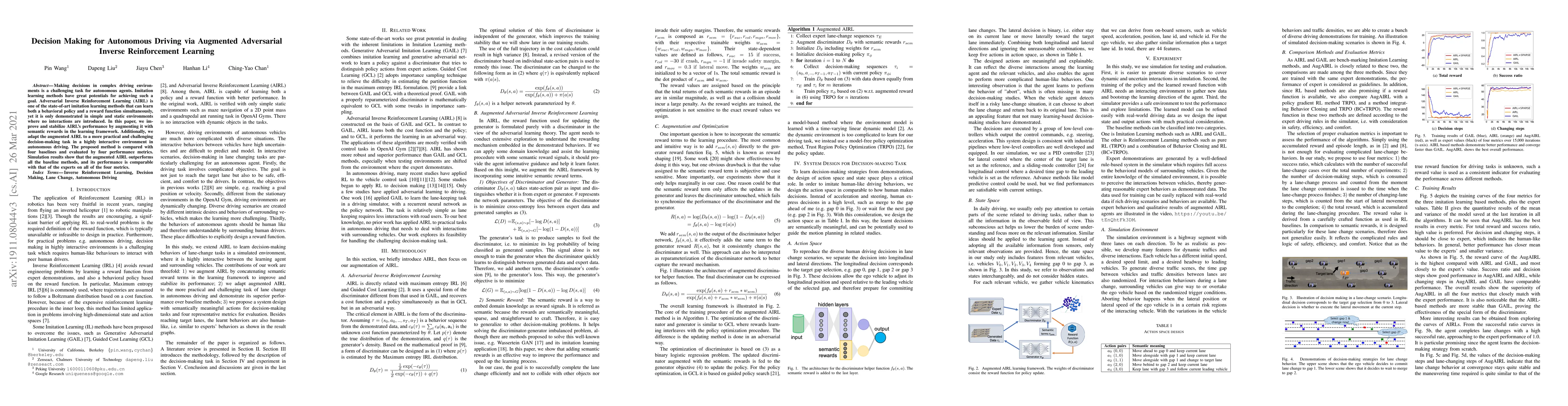This paper proposes an augmented adversarial inverse reinforcement learning (AIRL) method to improve decision making for autonomous driving in complex, interactive environments. The enhanced AIRL incorporates semantic rewards and outperforms four baselines in simulations, demonstrating comparable performance to expert drivers.