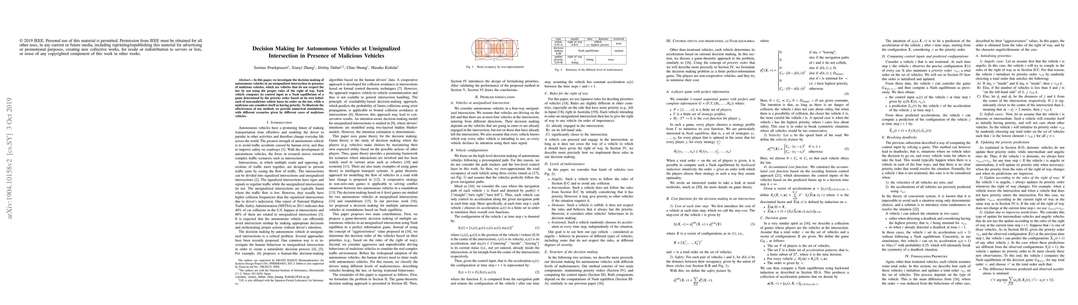 In this paper, we investigate the decision making of autonomous vehicles in an unsignalized intersection in presence of malicious vehicles, which are vehicles that do not respect the law by not using the proper rules of the right of way. Each vehicle computes its control input as a Nash equilibrium of a game determined by the priority order based on its own belief: each of non-malicious vehicle bases its order on the law, while a malicious one considers itself as having priority. To illustrate our method, we provide numerical simulations, with different scenarios given by different cases of malicious vehicles.