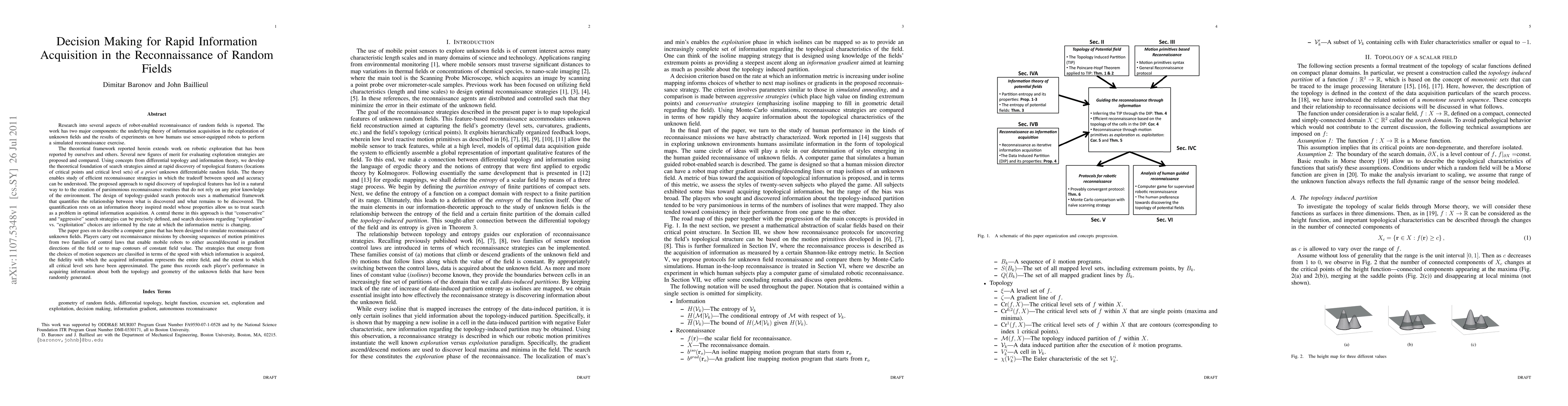 Research into several aspects of robot-enabled reconnaissance of random fields is reported. The work has two major components: the underlying theory of information acquisition in the exploration of unknown fields and the results of experiments on how humans use sensor-equipped robots to perform a simulated reconnaissance exercise. The theoretical framework reported herein extends work on robotic exploration that has been reported by ourselves and others. Several new figures of merit for evaluating exploration strategies are proposed and compared. Using concepts from differential topology and information theory, we develop the theoretical foundation of search strategies aimed at rapid discovery of topological features (locations of critical points and critical level sets) of a priori unknown differentiable random fields. The theory enables study of efficient reconnaissance strategies in which the tradeoff between speed and accuracy can be understood. The proposed approach to rapid discovery of topological features has led in a natural way to to the creation of parsimonious reconnaissance routines that do not rely on any prior knowledge of the environment. The design of topology-guided search protocols uses a mathematical framework that quantifies the relationship between what is discovered and what remains to be discovered. The quantification rests on an information theory inspired model whose properties allow us to treat search as a problem in optimal information acquisition. A central theme in this approach is that "conservative" and "aggressive" search strategies can be precisely defined, and search decisions regarding "exploration" vs. "exploitation" choices are informed by the rate at which the information metric is changing.
