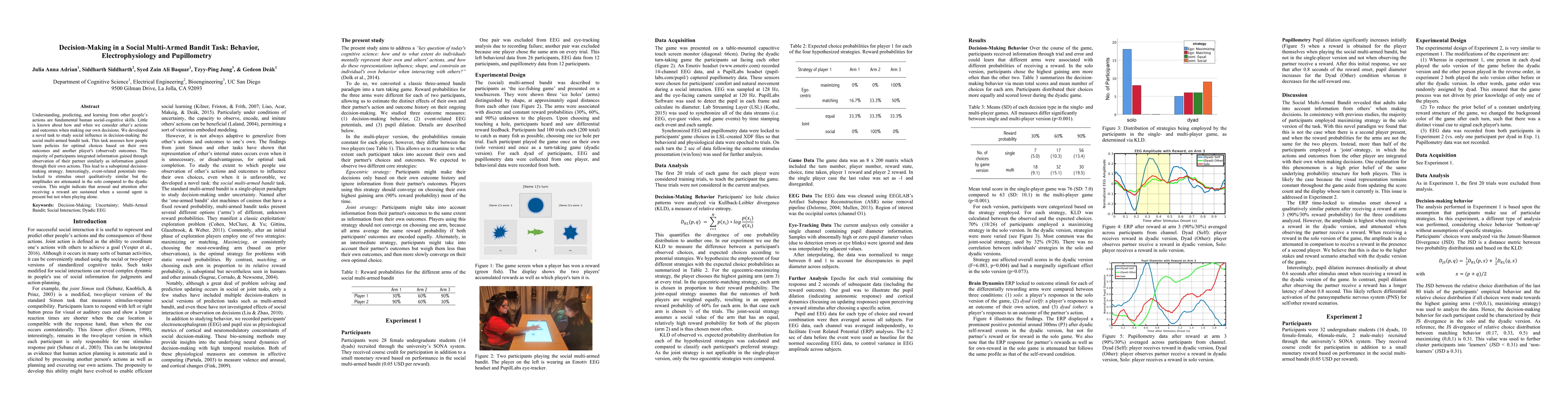 Understanding, predicting, and learning from other people's actions are fundamental human social-cognitive skills. Little is known about how and when we consider other's actions and outcomes when making our own decisions. We developed a novel task to study social influence in decision-making: the social multi-armed bandit task. This task assesses how people learn policies for optimal choices based on their own outcomes and another player's (observed) outcomes. The majority of participants integrated information gained through observation of their partner similarly as information gained through their own actions. This lead to a suboptimal decision-making strategy. Interestingly, event-related potentials time-locked to stimulus onset qualitatively similar but the amplitudes are attenuated in the solo compared to the dyadic version. This might indicate that arousal and attention after receiving a reward are sustained when a second agent is present but not when playing alone.