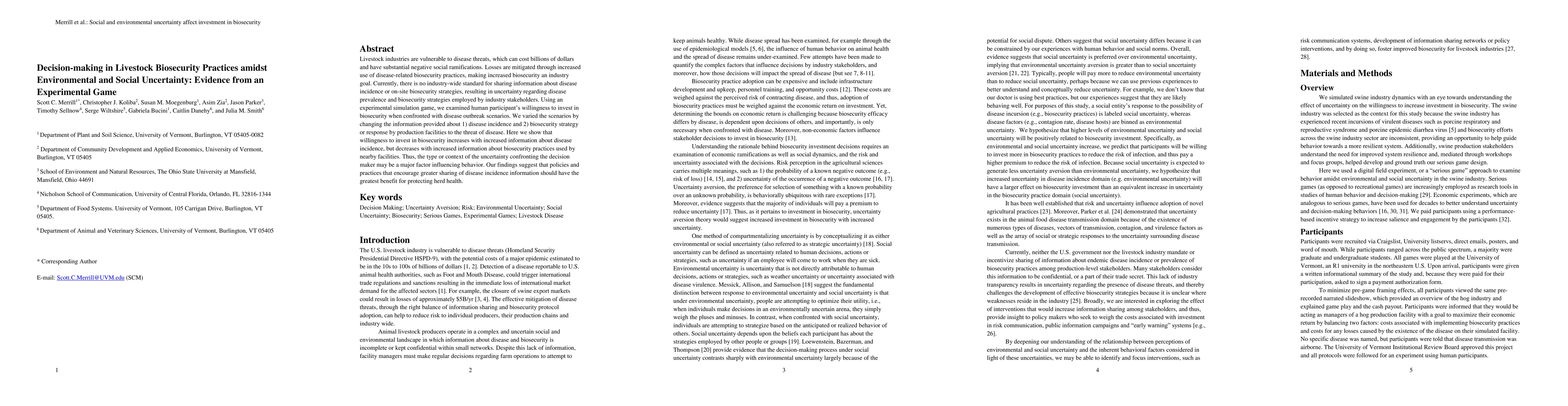 Livestock industries are vulnerable to disease threats, which can cost billions of dollars and have substantial negative social ramifications. Losses are mitigated through increased use of disease-related biosecurity practices, making increased biosecurity an industry goal. Currently, there is no industry-wide standard for sharing information about disease incidence or on-site biosecurity strategies, resulting in uncertainty regarding disease prevalence and biosecurity strategies employed by industry stakeholders. Using an experimental simulation game, we examined human participant's willingness to invest in biosecurity when confronted with disease outbreak scenarios. We varied the scenarios by changing the information provided about 1) disease incidence and 2) biosecurity strategy or response by production facilities to the threat of disease. Here we show that willingness to invest in biosecurity increases with increased information about disease incidence, but decreases with increased information about biosecurity practices used by nearby facilities. Thus, the type or context of the uncertainty confronting the decision maker may be a major factor influencing behavior. Our findings suggest that policies and practices that encourage greater sharing of disease incidence information should have the greatest benefit for protecting herd health.