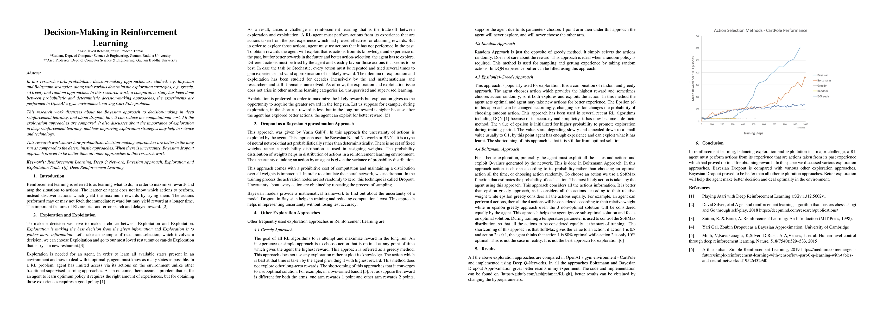 In this research work, probabilistic decision-making approaches are studied, e.g. Bayesian and Boltzmann strategies, along with various deterministic exploration strategies, e.g. greedy, epsilon-Greedy and random approaches. In this research work, a comparative study has been done between probabilistic and deterministic decision-making approaches, the experiments are performed in OpenAI gym environment, solving Cart Pole problem. This research work discusses about the Bayesian approach to decision-making in deep reinforcement learning, and about dropout, how it can reduce the computational cost. All the exploration approaches are compared. It also discusses about the importance of exploration in deep reinforcement learning, and how improving exploration strategies may help in science and technology. This research work shows how probabilistic decision-making approaches are better in the long run as compared to the deterministic approaches. When there is uncertainty, Bayesian dropout approach proved to be better than all other approaches in this research work.