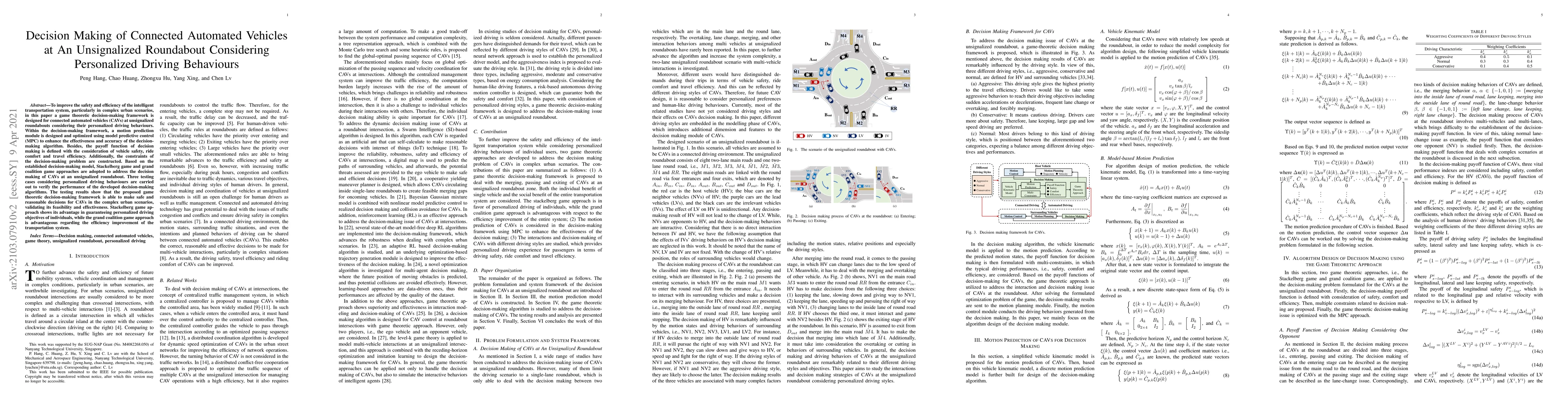 This paper proposes a game theoretic decision-making framework for connected automated vehicles at unsignalized roundabouts, considering personalized driving behaviors. The framework uses model predictive control and Stackelberg/grand coalition games to optimize safety, ride comfort, and travel efficiency, demonstrating its effectiveness through testing scenarios.