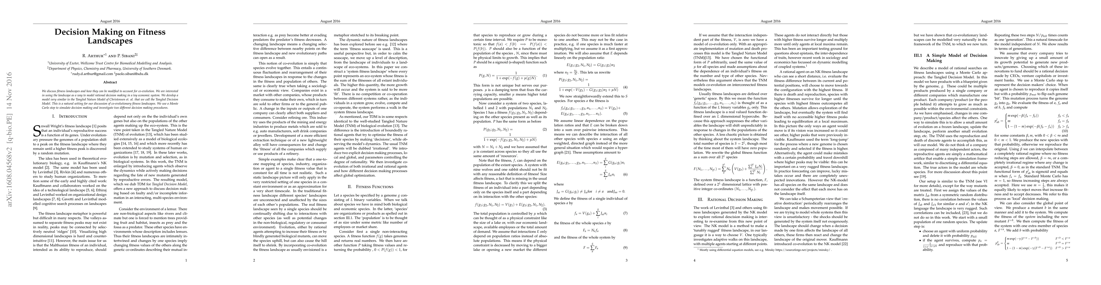We discuss fitness landscapes and how they can be modified to account for co-evolution. We are interested in using the landscape as a way to model rational decision making in a toy economic system. We develop a model very similar to the Tangled Nature Model of Christensen et. al. that we call the Tangled Decision Model. This is a natural setting for our discussion of co-evolutionary fitness landscapes. We use a Monte Carlo step to simulate decision making and investigate two different decision making procedures.