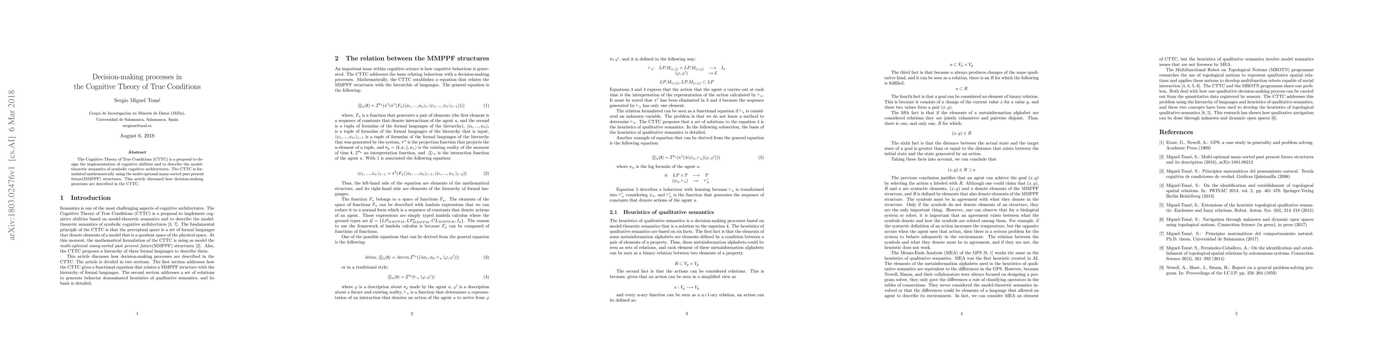The Cognitive Theory of True Conditions (CTTC) is a proposal to design the implementation of cognitive abilities and to describe the model-theoretic semantics of symbolic cognitive architectures. The CTTC is formulated mathematically using the multi-optional many-sorted past present future(MMPPF) structures. This article discussed how decision-making processes are described in the CTTC.