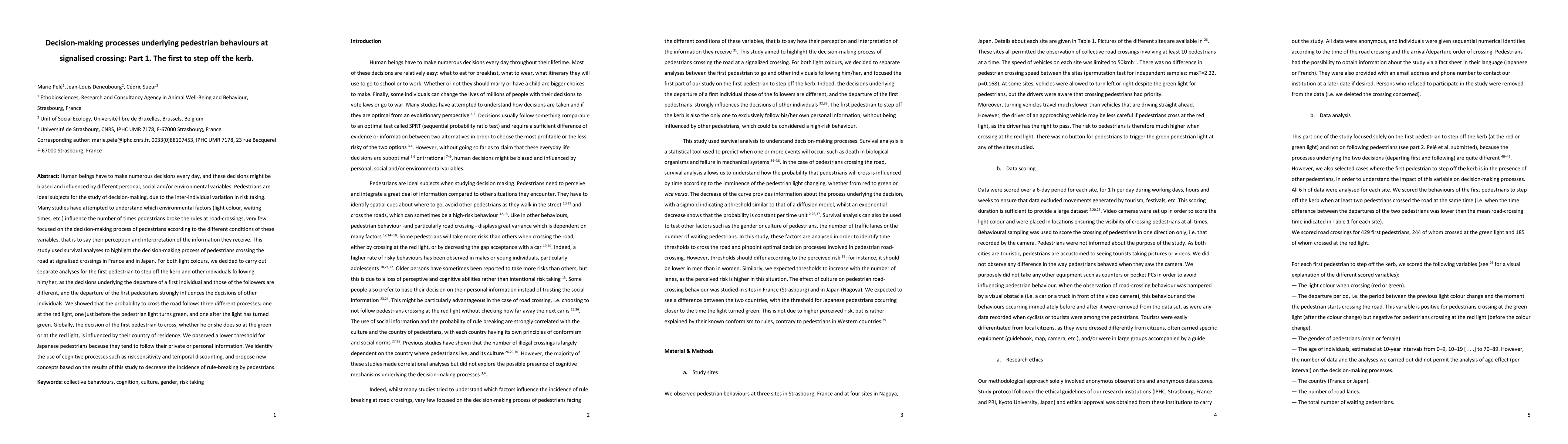 This study employed survival analyses to examine pedestrian decision-making processes at signalized crossings in France and Japan, focusing on the first pedestrian to step off the kerb.
