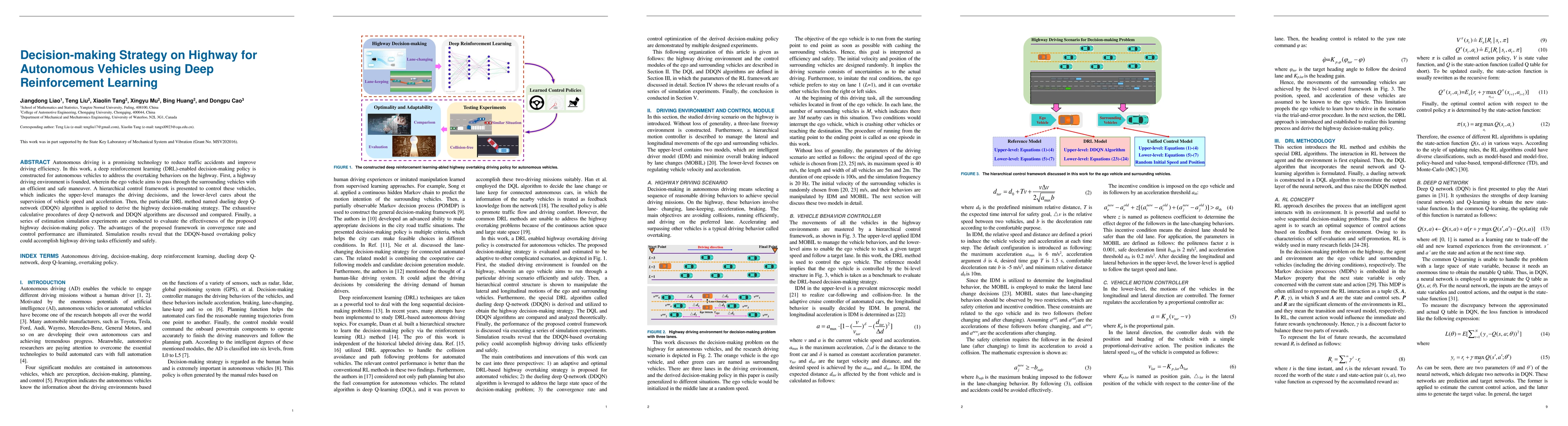 This research proposes a deep reinforcement learning (DRL) framework for autonomous vehicles to manage overtaking maneuvers on highways, using a dueling deep Q-network (DDQN) algorithm. Simulation results show the DDQN-based strategy effectively and safely accomplishes overtaking tasks, improving convergence and control performance.