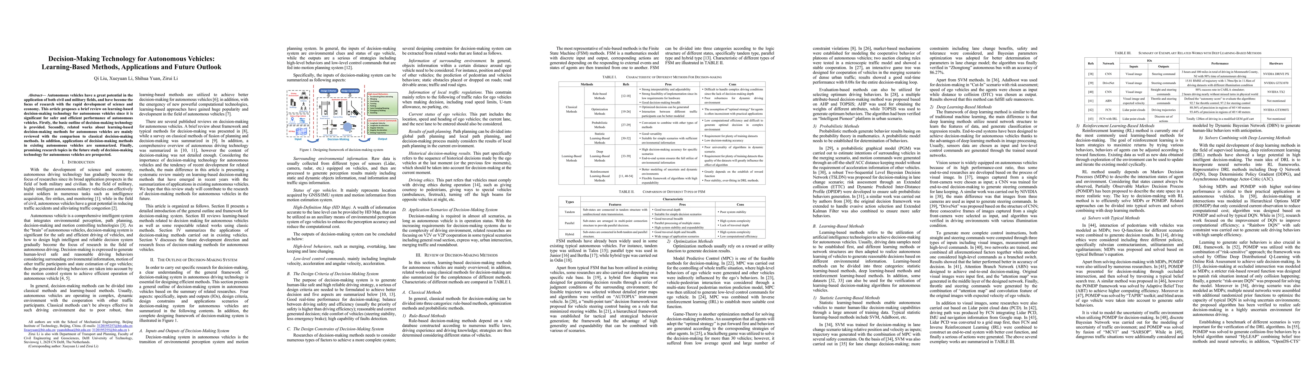 This paper reviews learning-based decision-making technologies for autonomous vehicles, comparing them to classical methods and highlighting their applications in current vehicles. It also explores future research directions to enhance the safety and efficiency of autonomous vehicles.