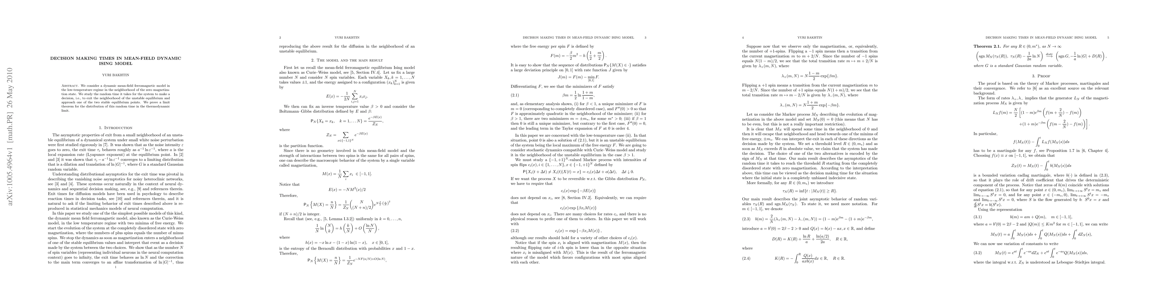 The paper presents a detailed mathematical analysis of a dynamic Ising model, proving a limit theorem for decision-making times in the thermodynamic limit using Markov processes and martingale convergence theory.