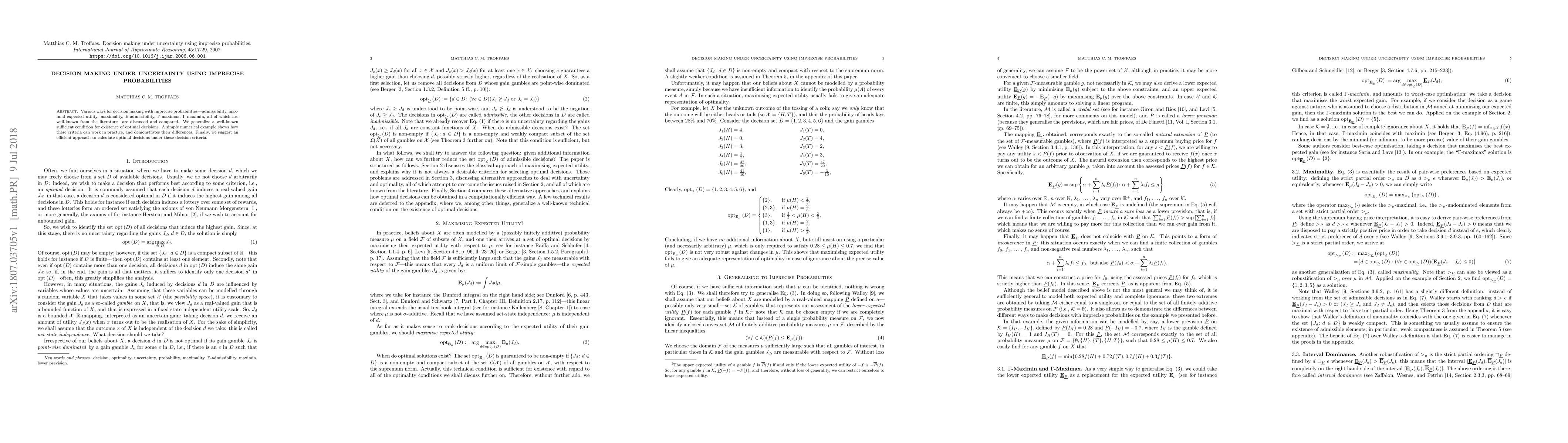 This paper discusses various decision-making methods under uncertainty using imprecise probabilities and compares criteria like admissibility and $\Gamma$-maximin. It generalizes a condition for optimal decision existence and proposes an efficient calculation method, illustrated with a practical example.