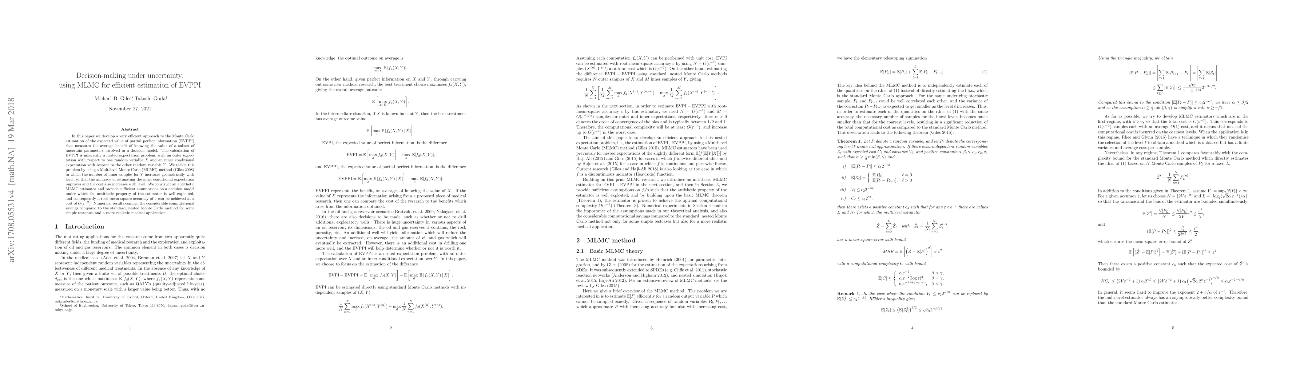 In this paper we develop a very efficient approach to the Monte Carlo estimation of the expected value of partial perfect information (EVPPI) that measures the average benefit of knowing the value of a subset of uncertain parameters involved in a decision model. The calculation of EVPPI is inherently a nested expectation problem, with an outer expectation with respect to one random variable $X$ and an inner conditional expectation with respect to the other random variable $Y$. We tackle this problem by using a Multilevel Monte Carlo (MLMC) method (Giles 2008) in which the number of inner samples for $Y$ increases geometrically with level, so that the accuracy of estimating the inner conditional expectation improves and the cost also increases with level. We construct an antithetic MLMC estimator and provide sufficient assumptions on a decision model under which the antithetic property of the estimator is well exploited, and consequently a root-mean-square accuracy of $\varepsilon$ can be achieved at a cost of $O(\varepsilon^{-2})$. Numerical results confirm the considerable computational savings compared to the standard, nested Monte Carlo method for some simple testcases and a more realistic medical application.
