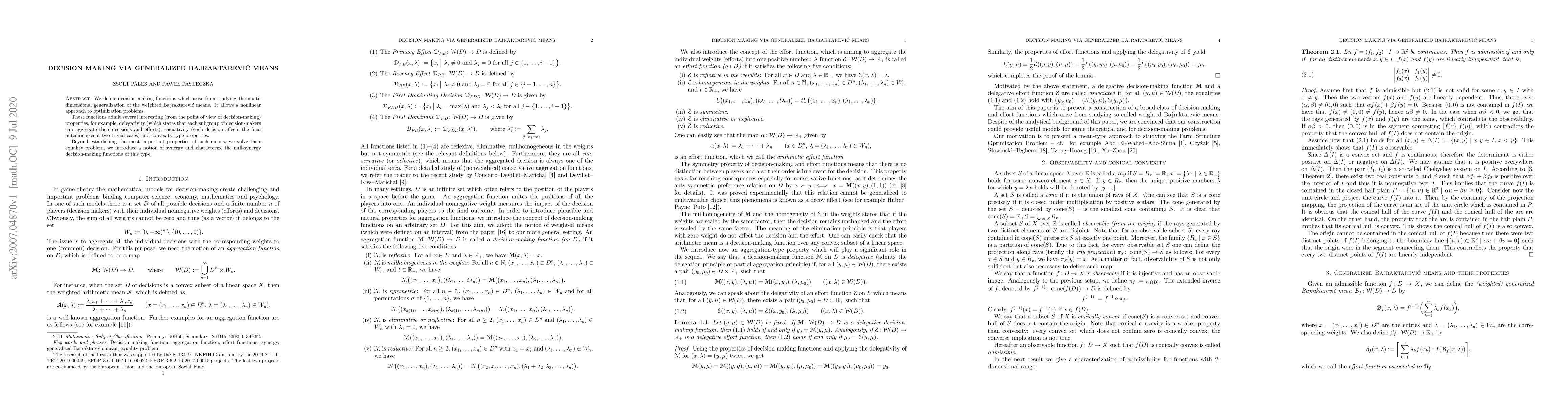 This paper introduces decision-making functions based on generalized Bajraktarević means, offering a nonlinear approach to optimization. It establishes key properties like delegativity, casuativity, and convexity, and solves the equality problem, introducing a concept of synergy and characterizing null-synergy decision-making functions.