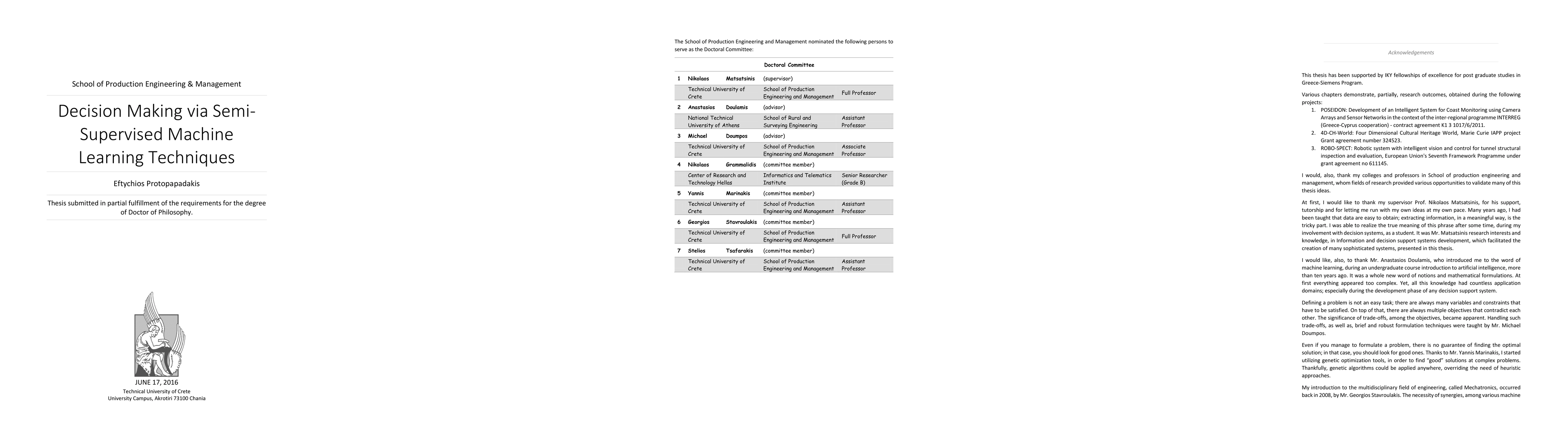 Semi-supervised learning (SSL) is a class of supervised learning tasks and techniques that also exploits the unlabeled data for training. SSL significantly reduces labeling related costs and is able to handle large data sets. The primary objective is the extraction of robust inference rules. Decision support systems (DSSs) who utilize SSL have significant advantages. Only a small amount of labelled data is required for the initialization. Then, new (unlabeled) data can be utilized and improve system's performance. Thus, the DSS is continuously adopted to new conditions, with minimum effort. Techniques which are cost effective and easily adopted to dynamic systems, can be beneficial for many practical applications. Such applications fields are: (a) industrial assembly lines monitoring, (b) sea border surveillance, (c) elders' falls detection, (d) transportation tunnels inspection, (e) concrete foundation piles defect recognition, (f) commercial sector companies financial assessment and (g) image advanced filtering for cultural heritage applications.