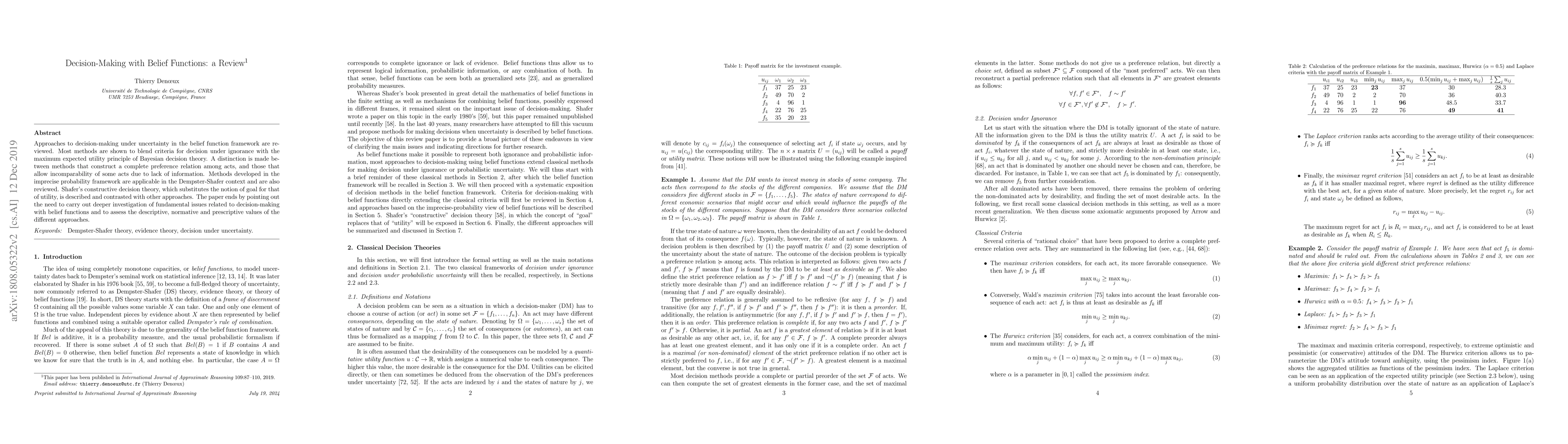 This paper reviews decision-making methods under uncertainty using belief functions, blending criteria for decision under ignorance with Bayesian principles. It distinguishes between methods that establish complete preference relations and those allowing for incomparability due to information gaps, and discusses the applicability of imprecise probability frameworks in the Dempster-Shafer context.