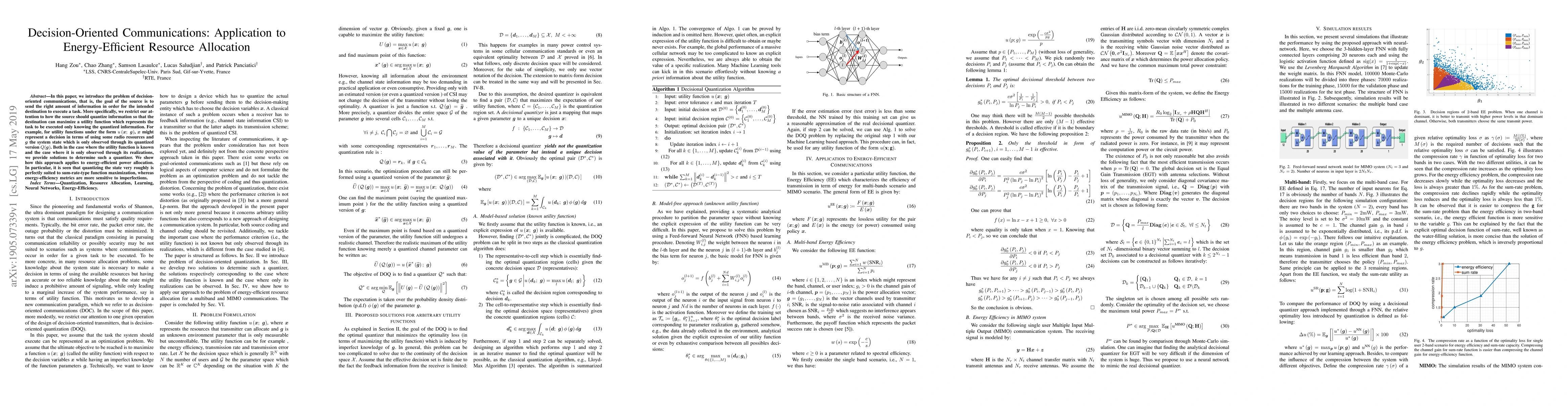 In this paper, we introduce the problem of decision-oriented communications, that is, the goal of the source is to send the right amount of information in order for the intended destination to execute a task. More specifically, we restrict our attention to how the source should quantize information so that the destination can maximize a utility function which represents the task to be executed only knowing the quantized information. For example, for utility functions under the form $u\left(\boldsymbol{x};\ \boldsymbol{g}\right)$, $\boldsymbol{x}$ might represent a decision in terms of using some radio resources and $\boldsymbol{g}$ the system state which is only observed through its quantized version $Q(\boldsymbol{g})$. Both in the case where the utility function is known and the case where it is only observed through its realizations, we provide solutions to determine such a quantizer. We show how this approach applies to energy-efficient power allocation. In particular, it is seen that quantizing the state very roughly is perfectly suited to sum-rate-type function maximization, whereas energy-efficiency metrics are more sensitive to imperfections.