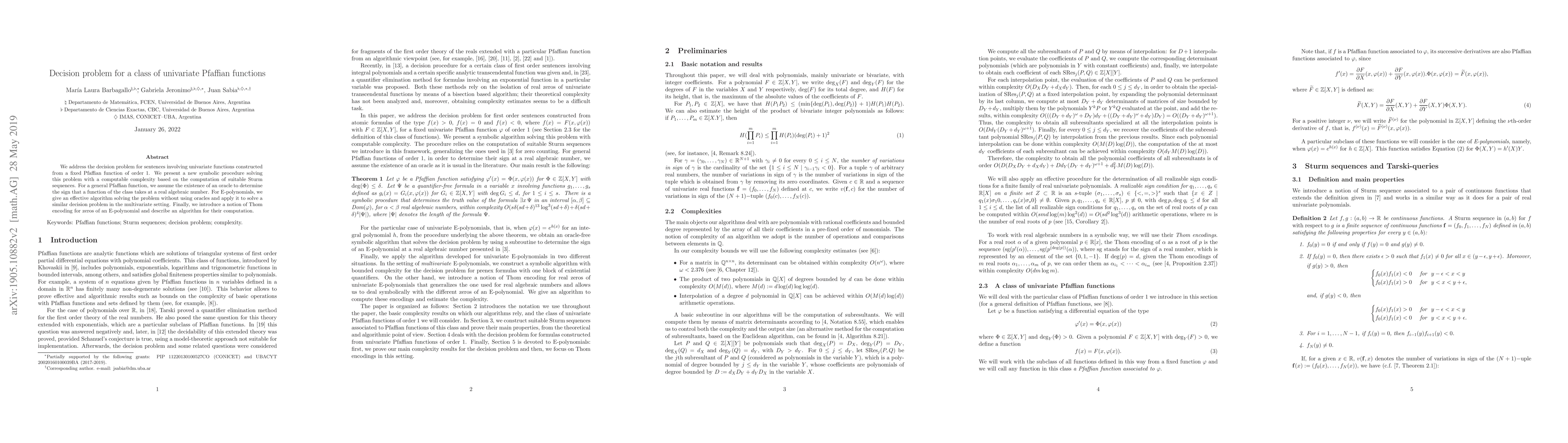 We address the decision problem for sentences involving univariate functions constructed from a fixed Pfaffian function of order $1$. We present a new symbolic procedure solving this problem with a computable complexity based on the computation of suitable Sturm sequences. For a general Pfaffian function, we assume the existence of an oracle to determine the sign that a function of the class takes at a real algebraic number. For E-polynomials, we give an effective algorithm solving the problem without using oracles and apply it to solve a similar decision problem in the multivariate setting. Finally, we introduce a notion of Thom encoding for zeros of an E-polynomial and describe an algorithm for their computation.