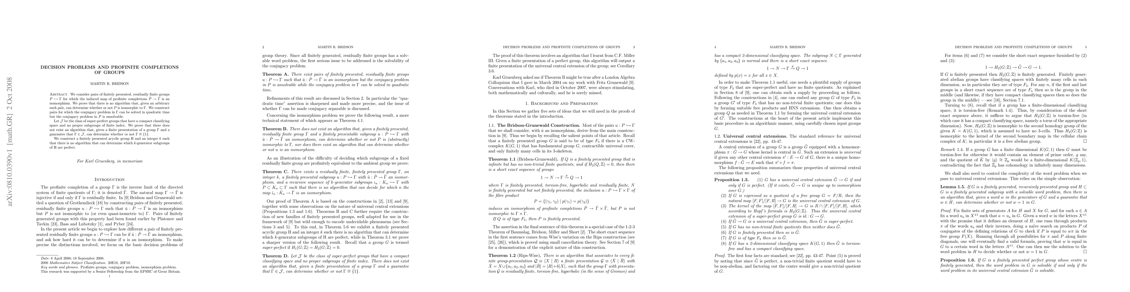 We consider pairs of finitely presented, residually finite groups $P\hookrightarrow\G$ for which the induced map of profinite completions $\hat P\to \hat\G$ is an isomorphism. We prove that there is no algorithm that, given an arbitrary such pair, can determine whether or not $P$ is isomorphic to $\G$. We construct pairs for which the conjugacy problem in $\G$ can be solved in quadratic time but the conjugacy problem in $P$ is unsolvable. Let $\mathcal J$ be the class of super-perfect groups that have a compact classifying space and no proper subgroups of finite index. We prove that there does not exist an algorithm that, given a finite presentation of a group $\G$ and a guarantee that $\G\in\mathcal J$, can determine whether or not $\G\cong\{1\}$. We construct a finitely presented acyclic group $\H$ and an integer $k$ such that there is no algorithm that can determine which $k$-generator subgroups of $\H$ are perfect.