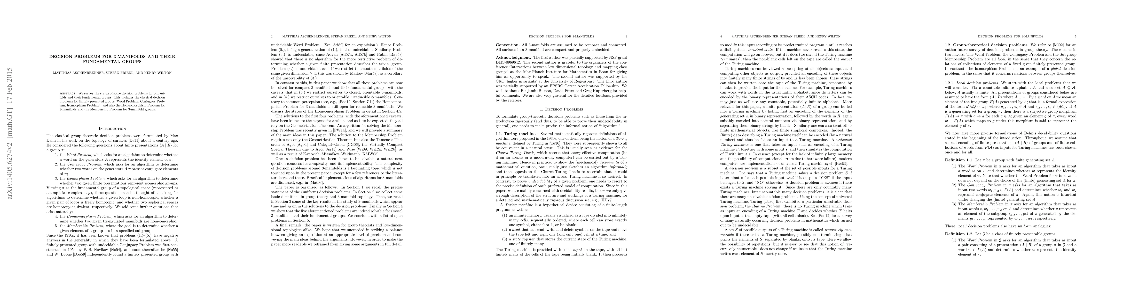 This paper surveys decision problems for 3-manifolds and their fundamental groups, including classical group problems like the Word, Conjugacy, and Isomorphism Problems, as well as the Homeomorphism Problem for 3-manifolds and the Membership Problem for 3-manifold groups.
