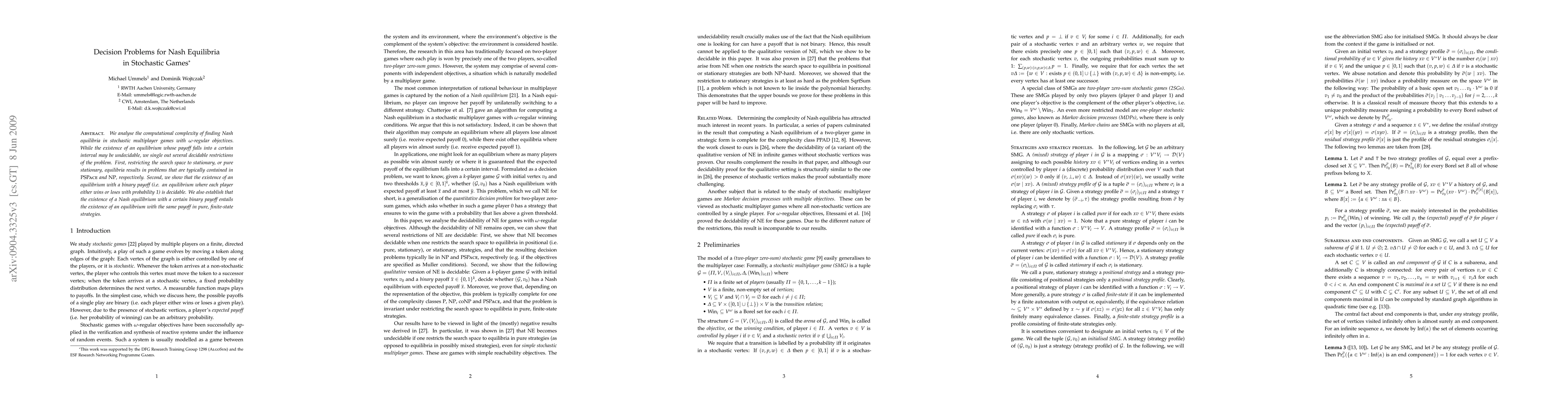 We analyse the computational complexity of finding Nash equilibria in stochastic multiplayer games with $\omega$-regular objectives. While the existence of an equilibrium whose payoff falls into a certain interval may be undecidable, we single out several decidable restrictions of the problem. First, restricting the search space to stationary, or pure stationary, equilibria results in problems that are typically contained in PSPACE and NP, respectively. Second, we show that the existence of an equilibrium with a binary payoff (i.e. an equilibrium where each player either wins or loses with probability 1) is decidable. We also establish that the existence of a Nash equilibrium with a certain binary payoff entails the existence of an equilibrium with the same payoff in pure, finite-state strategies.