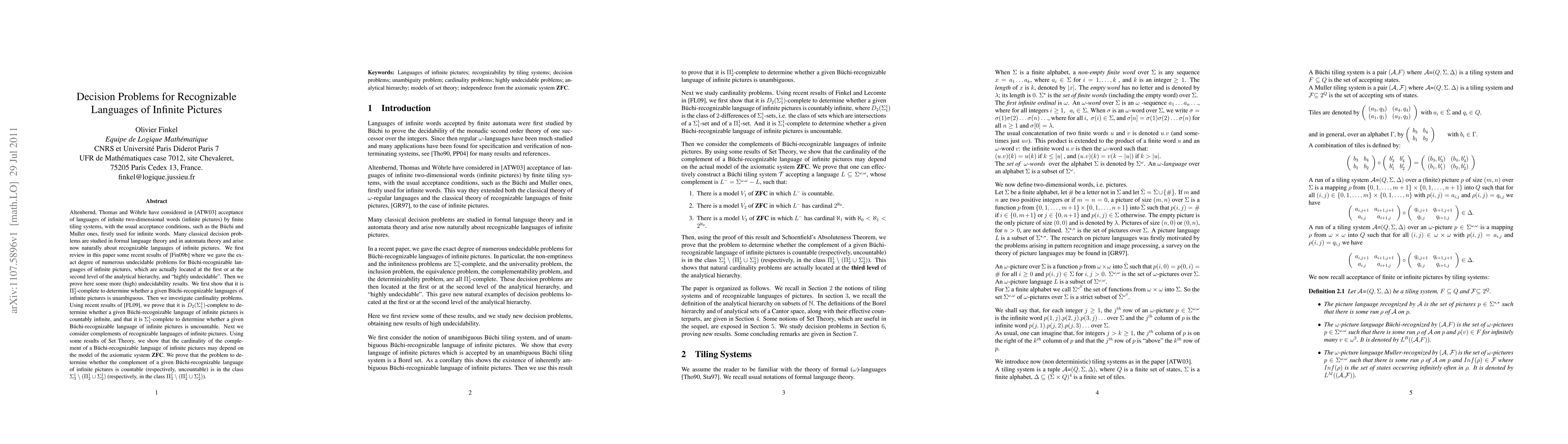 Altenbernd, Thomas and W\"ohrle have considered in [ATW02] acceptance of languages of infinite two-dimensional words (infinite pictures) by finite tiling systems, with the usual acceptance conditions, such as the B\"uchi and Muller ones, firstly used for infinite words. Many classical decision problems are studied in formal language theory and in automata theory and arise now naturally about recognizable languages of infinite pictures. We first review in this paper some recent results of [Fin09b] where we gave the exact degree of numerous undecidable problems for B\"uchi-recognizable languages of infinite pictures, which are actually located at the first or at the second level of the analytical hierarchy, and "highly undecidable". Then we prove here some more (high) undecidability results. We first show that it is $\Pi_2^1$-complete to determine whether a given B\"uchi-recognizable languages of infinite pictures is unambiguous. Then we investigate cardinality problems. Using recent results of [FL09], we prove that it is $D_2(\Sigma_1^1)$-complete to determine whether a given B\"uchi-recognizable language of infinite pictures is countably infinite, and that it is $\Sigma_1^1$-complete to determine whether a given B\"uchi-recognizable language of infinite pictures is uncountable. Next we consider complements of recognizable languages of infinite pictures. Using some results of Set Theory, we show that the cardinality of the complement of a B\"uchi-recognizable language of infinite pictures may depend on the model of the axiomatic system ZFC. We prove that the problem to determine whether the complement of a given B\"uchi-recognizable language of infinite pictures is countable (respectively, uncountable) is in the class $\Sigma_3^1 \setminus (\Pi_2^1 \cup \Sigma_2^1)$ (respectively, in the class $\Pi_3^1 \setminus (\Pi_2^1 \cup \Sigma_2^1)$).