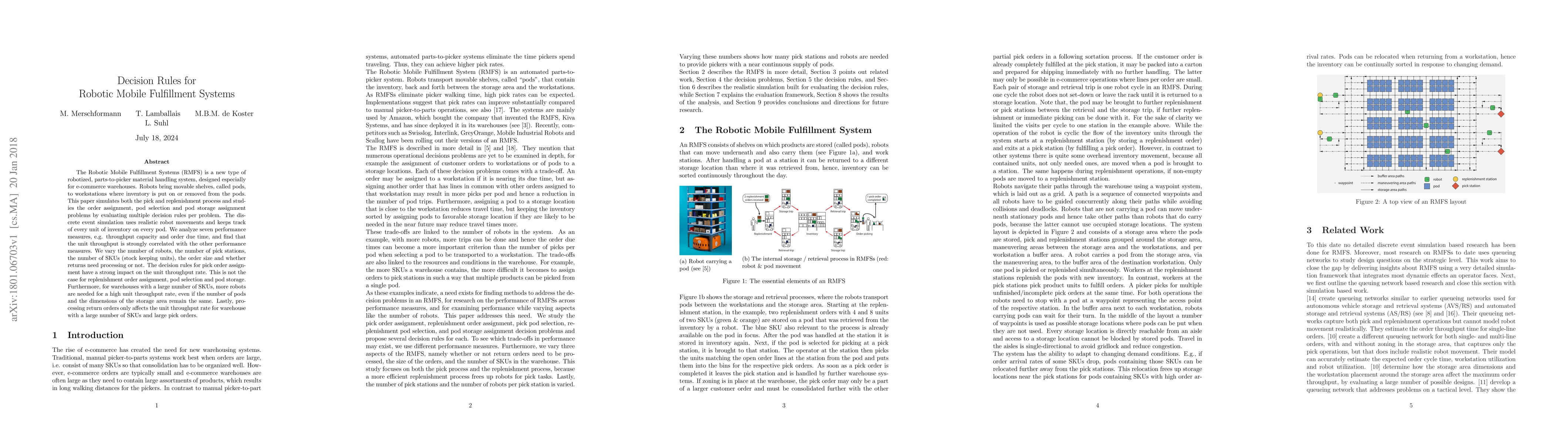 This paper evaluates decision rules for Robotic Mobile Fulfillment Systems (RMFS) in e-commerce warehouses, focusing on pick and replenishment processes. It finds that pick order assignment rules significantly impact unit throughput, while other factors like the number of SKUs and robots have varying effects on performance measures.
