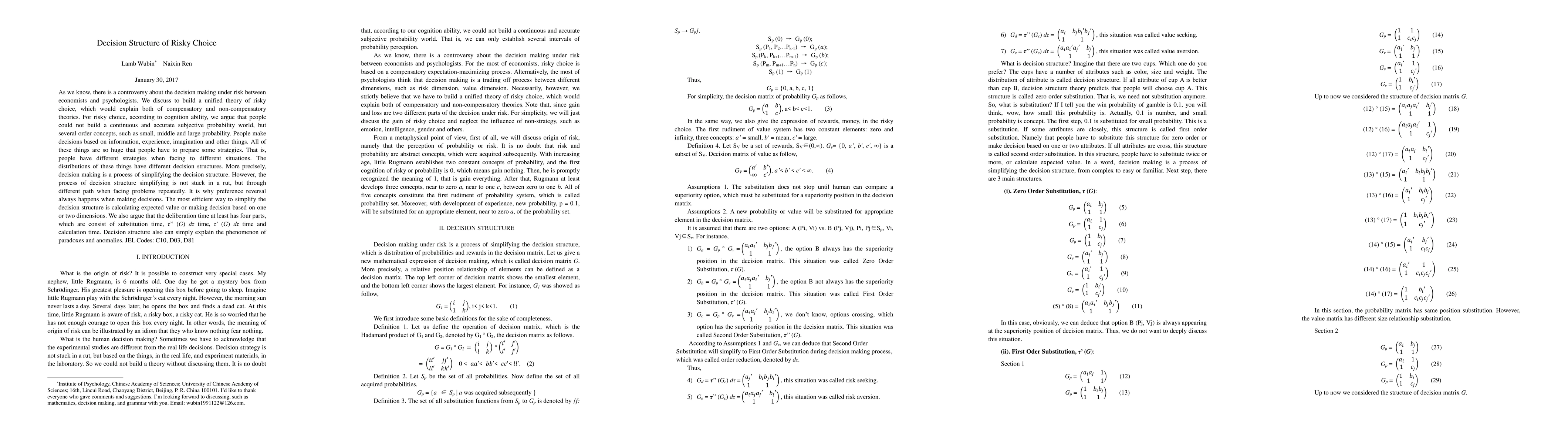 As we know, there is a controversy about the decision making under risk between economists and psychologists. We discuss to build a unified theory of risky choice, which would explain both of compensatory and non-compensatory theories. For risky choice, according to cognition ability, we argue that people could not build a continuous and accurate subjective probability world, but several order concepts, such as small, middle and large probability. People make decisions based on information, experience, imagination and other things. All of these things are so huge that people have to prepare some strategies. That is, people have different strategies when facing to different situations. The distributions of these things have different decision structures. More precisely, decision making is a process of simplifying the decision structure. However, the process of decision structure simplifying is not stuck in a rut, but through different path when facing problems repeatedly. It is why preference reversal always happens when making decisions. The most efficient way to simplify the decision structure is calculating expected value or making decisions based on one or two dimensions. We also argue that the deliberation time at least has four parts, which are consist of substitution time, first order time, second order time and calculation time. Decision structure also can simply explain the phenomenon of paradoxes and anomalies. JEL Codes: C10, D03, D81
