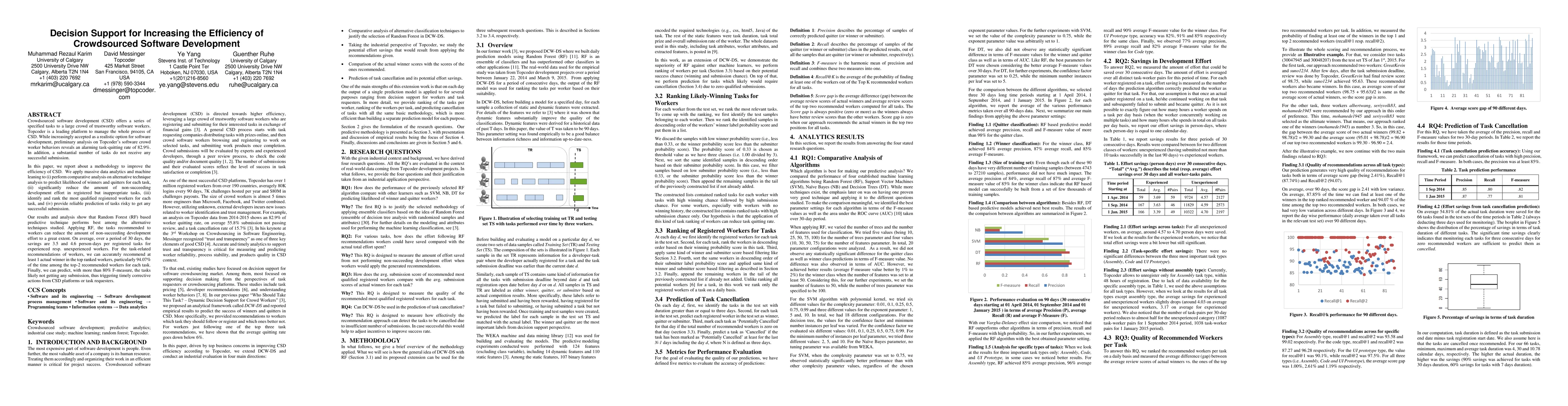 This paper proposes a methodology using machine learning to enhance the efficiency of crowdsourced software development (CSD) on platforms like Topcoder. The study applies Random Forest to predict task outcomes and worker suitability, significantly reducing non-succeeding efforts and identifying high-quality workers, leading to substantial time savings and improved task success rates.