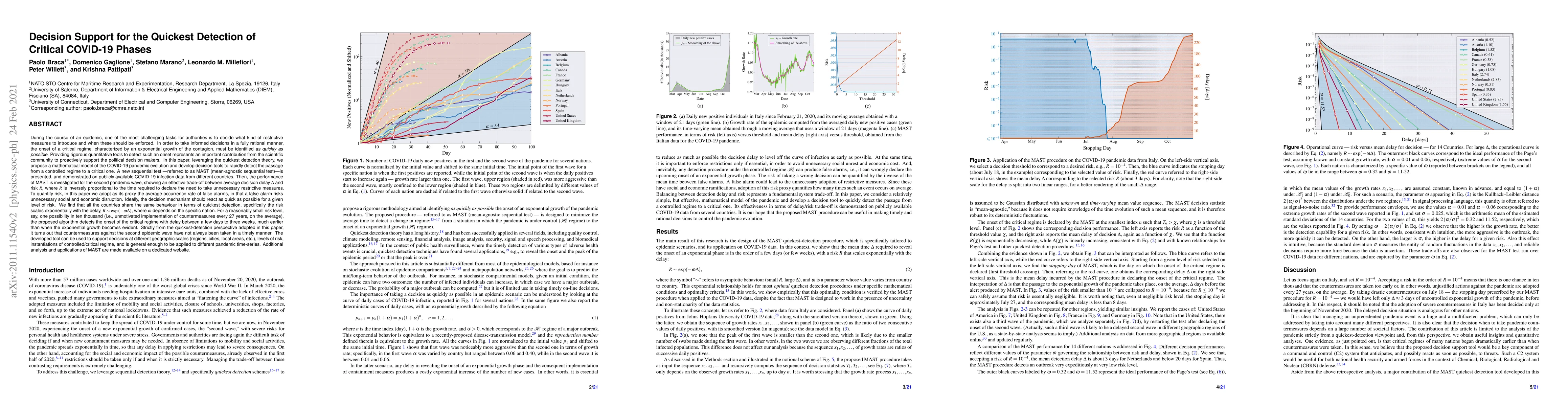 During the course of an epidemic, one of the most challenging tasks for authorities is to decide what kind of restrictive measures to introduce and when these should be enforced. In order to take informed decisions in a fully rational manner, the onset of a critical regime, characterized by an exponential growth of the contagion, must be identified as quickly as possible. Providing rigorous quantitative tools to detect such an onset represents an important contribution from the scientific community to proactively support the political decision makers. In this paper, leveraging the quickest detection theory, we propose a mathematical model of the COVID-19 pandemic evolution and develop decision tools to rapidly detect the passage from a controlled regime to a critical one. A new sequential test -- referred to as MAST (mean-agnostic sequential test) -- is presented, and demonstrated on publicly available COVID-19 infection data from different countries. Then, the performance of MAST is investigated for the second pandemic wave, showing an effective trade-off between average decision delay $\Delta$ and risk $R$, where $R$ is inversely proportional to the time required to declare the need to take unnecessary restrictive measures. Ideally, the decision mechanism should react as quick as possible for a given level of risk. We find that all the countries share the same behaviour in terms of quickest detection, specifically the risk scales exponentially with the delay, $R \sim \exp{(-\omega \Delta)}$, where $\omega$ depends on the specific nation. For a reasonably small risk level, say, one possibility in ten thousand (i.e., unmotivated implementation of countermeasures every 27 years, on the average), the proposed algorithm detects the onset of the critical regime with delay between a few days to three weeks, much earlier than when the exponential growth becomes evident.