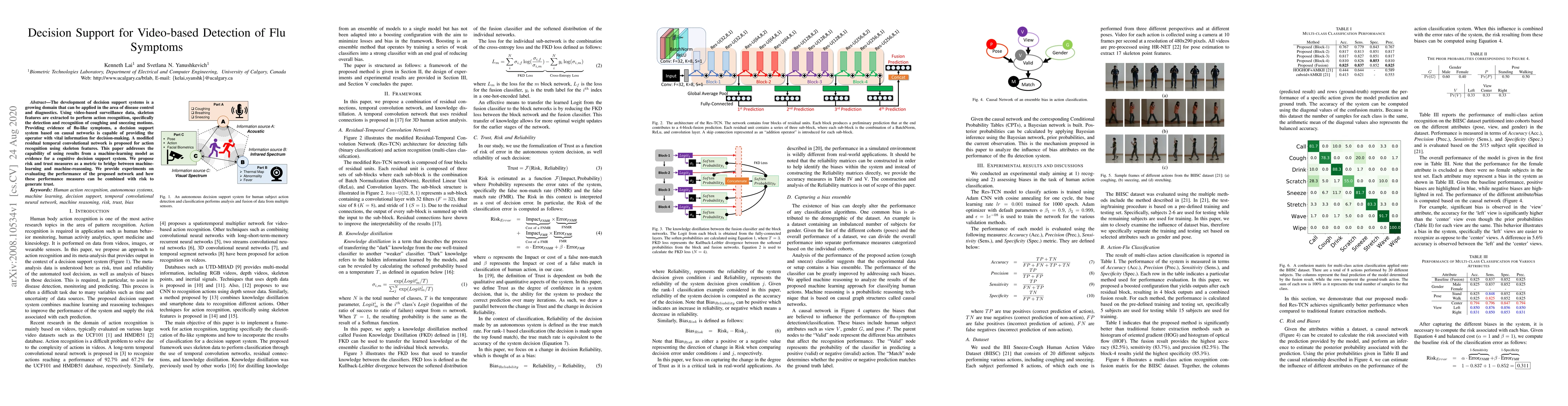 This paper proposes a decision support system for detecting flu symptoms via video surveillance, utilizing skeleton features and a modified residual temporal convolutional network for action recognition. It integrates machine-learning results into a cognitive decision support system, employing risk and trust measures to bridge machine-learning and machine-reasoning, and evaluates the network's performance.
