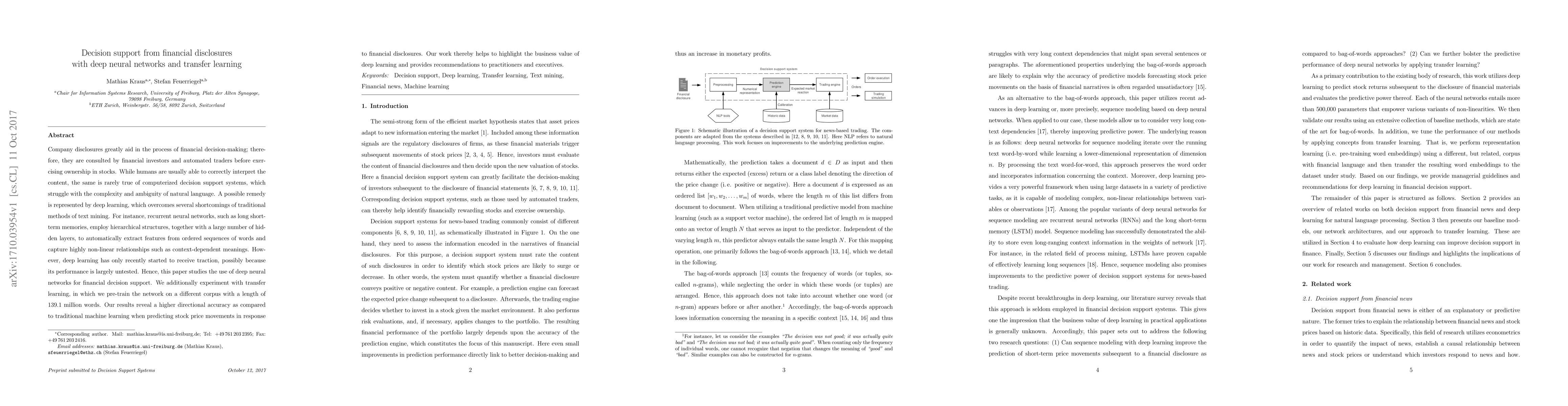 This paper explores the use of deep neural networks, particularly long short-term memory (LSTM) networks, for financial decision support from company disclosures, demonstrating improved accuracy over traditional methods. It also employs transfer learning, pre-training on a large corpus, to enhance performance, showing better predictive accuracy for stock price movements.