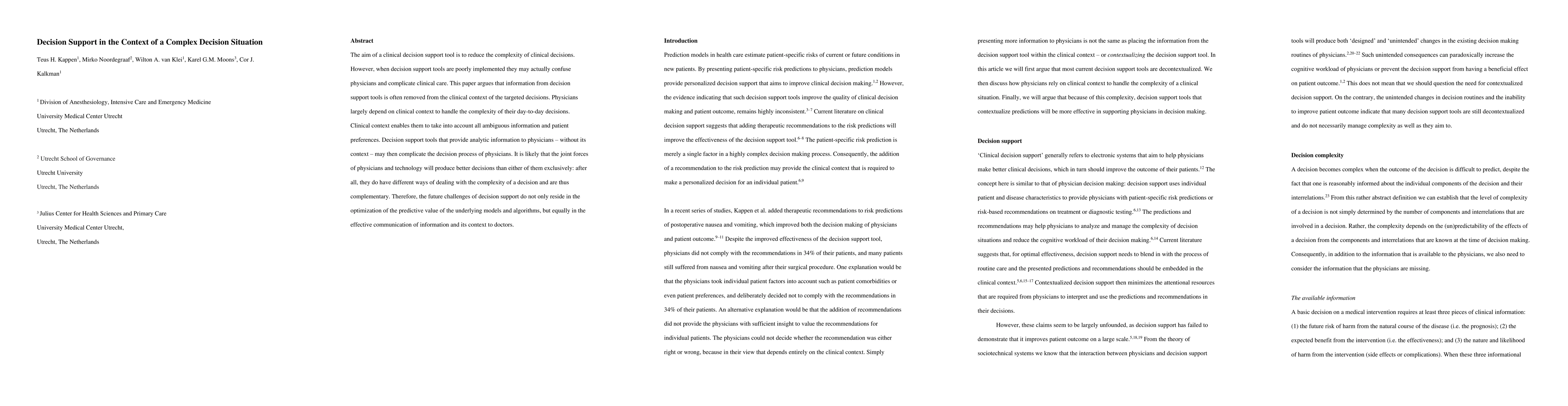 The aim of a clinical decision support tool is to reduce the complexity of clinical decisions. However, when decision support tools are poorly implemented they may actually confuse physicians and complicate clinical care. This paper argues that information from decision support tools is often removed from the clinical context of the targeted decisions. Physicians largely depend on clinical context to handle the complexity of their day-to-day decisions. Clinical context enables them to take into account all ambiguous information and patient preferences. Decision support tools that provide analytic information to physicians, without its context, may then complicate the decision process of physicians. It is likely that the joint forces of physicians and technology will produce better decisions than either of them exclusively: after all, they do have different ways of dealing with the complexity of a decision and are thus complementary. Therefore, the future challenges of decision support do not only reside in the optimization of the predictive value of the underlying models and algorithms, but equally in the effective communication of information and its context to doctors.