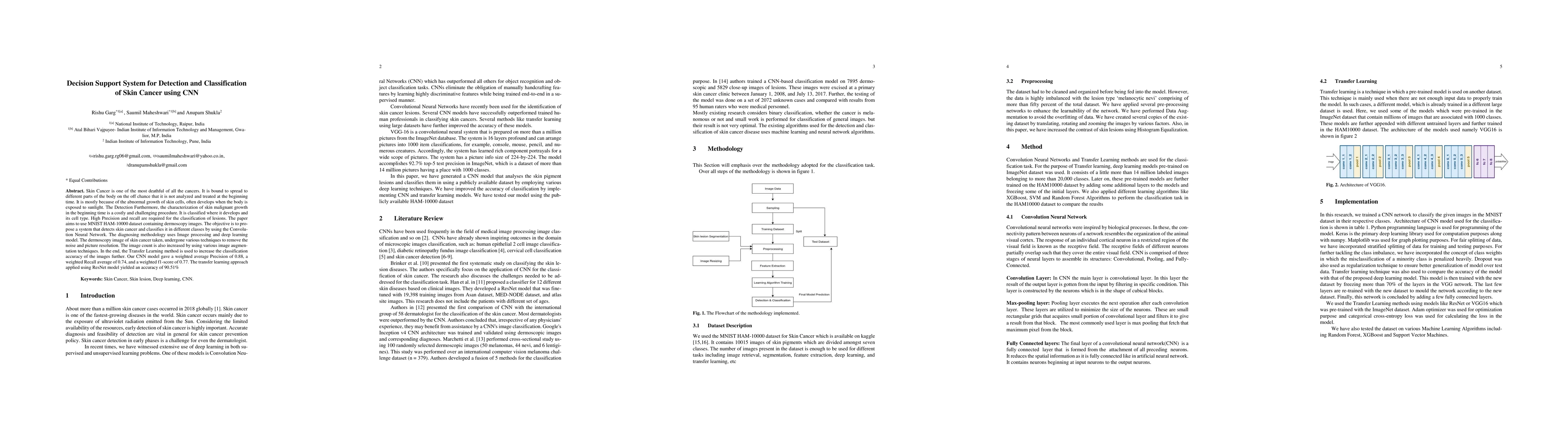 This research proposes a decision support system using a Convolutional Neural Network (CNN) to detect and classify skin cancer from dermoscopy images. The study employs the MNIST HAM-10000 dataset, applying image processing, augmentation, and transfer learning with ResNet to achieve a 90.51% accuracy, 0.88 precision, 0.74 recall, and 0.77 f1-score.