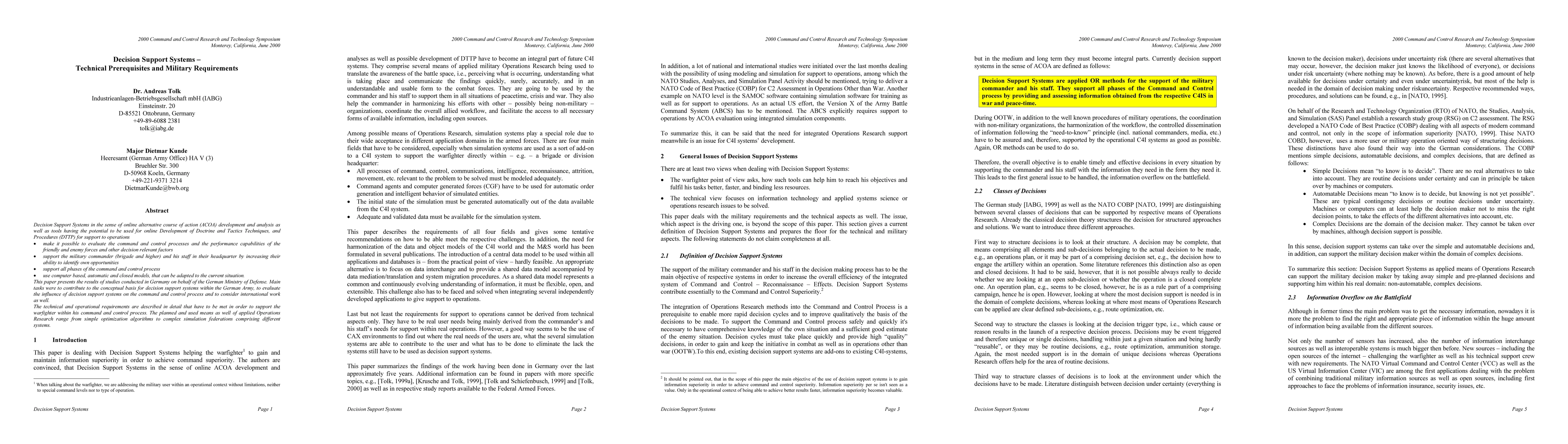Decision Support Systems in the sense of online alternative course of action (ACAO) development and analysis as well as tools for online Development of Doctrine and Tactics Techniques, and Procedures (DTTP) for support to operations make it possible to evaluate and forecast the command and control processes and the performance capabilities of the friendly and enemy forces and other decision relevant factors, support the military commander (brigade and higher) and his staff in their headquarter by increasing their ability to identify own opportunities, support all phases of the command and control process, use computer based, automatic and closed models, that can be adapted to the current situation. Objective of the paper is to present the results of studies conducted in Germany on behalf of the German Ministry of Defense with the objective to work out the conceptual basis for decision support systems and to evaluate, how this technique will influence the command and control system of the army of the federal armed forces. In addition, international works are considered as well. In this paper, technical and operational requirements are derived and described in detail that have to be met in order to support the warfighter by integrated means of applied Operations Research ranging from simple optimization algorithms to complex simulation federations comprising different systems.