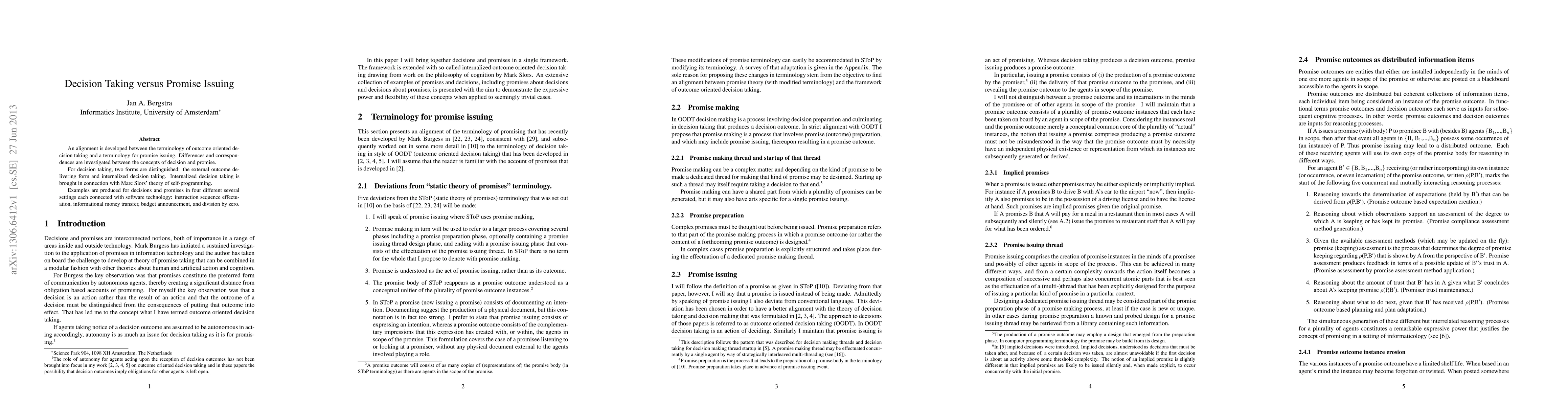 An alignment is developed between the terminology of outcome oriented decision taking and a terminology for promise issuing. Differences and correspondences are investigated between the concepts of decision and promise. For decision taking, two forms are distinguished: the external outcome delivering form and internalized decision taking. Internalized decision taking is brought in connection with Marc Slors' theory of self-programming. Examples are produced for decisions and promises in four different several settings each connected with software technology: instruction sequence effectuation, informational money transfer, budget announcement, and division by zero.