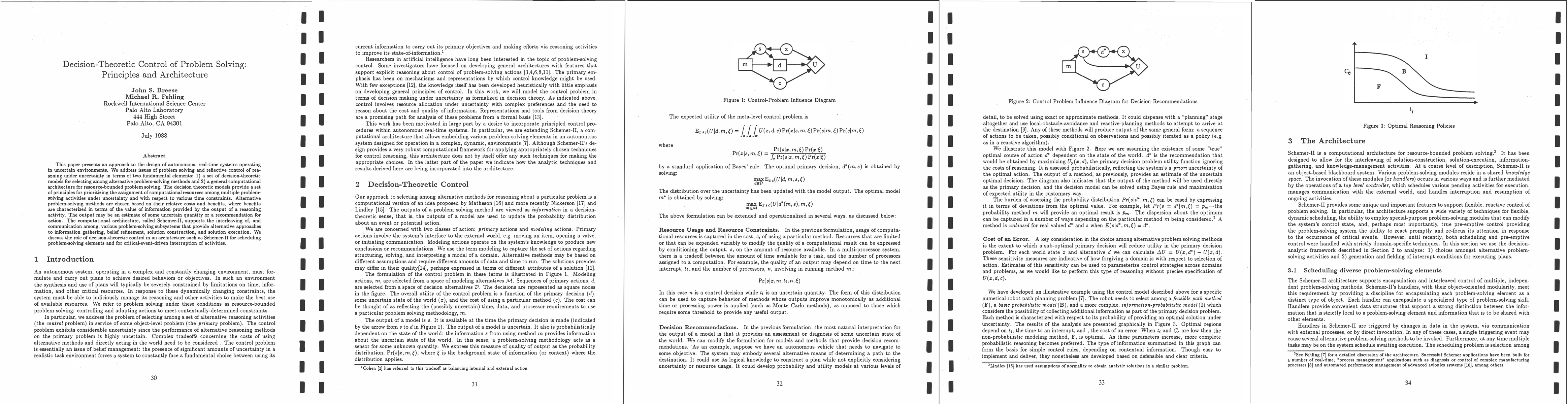 This paper presents an approach to the design of autonomous, real-time systems operating in uncertain environments. We address issues of problem solving and reflective control of reasoning under uncertainty in terms of two fundamental elements: l) a set of decision-theoretic models for selecting among alternative problem-solving methods and 2) a general computational architecture for resource-bounded problem solving. The decisiontheoretic models provide a set of principles for choosing among alternative problem-solving methods based on their relative costs and benefits, where benefits are characterized in terms of the value of information provided by the output of a reasoning activity. The output may be an estimate of some uncertain quantity or a recommendation for action. The computational architecture, called Schemer-ll, provides for interleaving of and communication among various problem-solving subsystems. These subsystems provide alternative approaches to information gathering, belief refinement, solution construction, and solution execution. In particular, the architecture provides a mechanism for interrupting the subsystems in response to critical events. We provide a decision theoretic account for scheduling problem-solving elements and for critical-event-driven interruption of activities in an architecture such as Schemer-II.