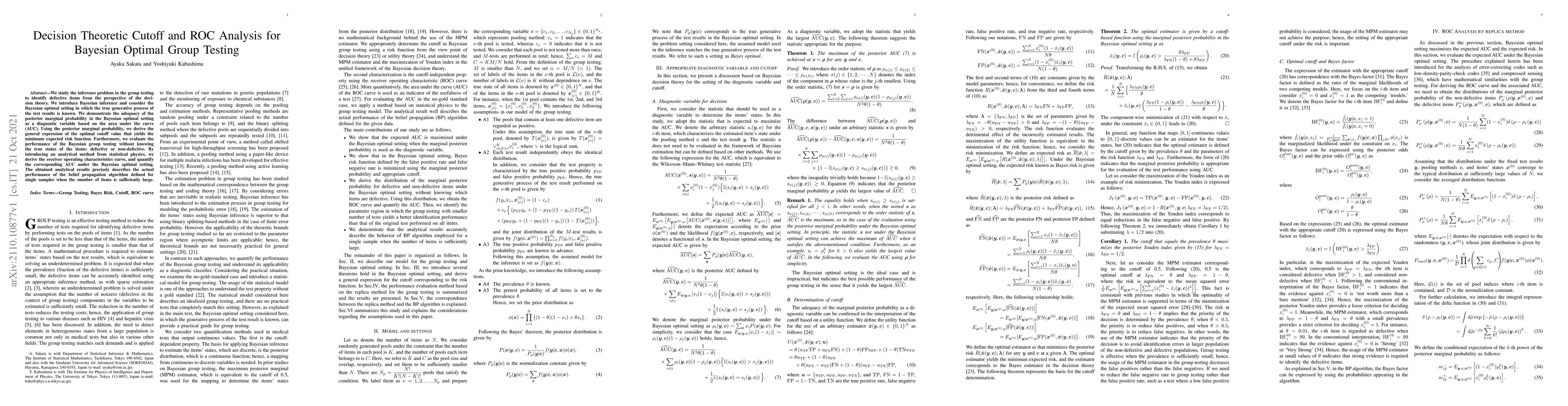 This paper uses Bayesian inference to optimize group testing for defect identification, finding that a specific cutoff value yields the minimum expected risk function. It also derives a receiver operating characteristics curve and accurately predicts the performance of a belief propagation algorithm in large sample sizes.