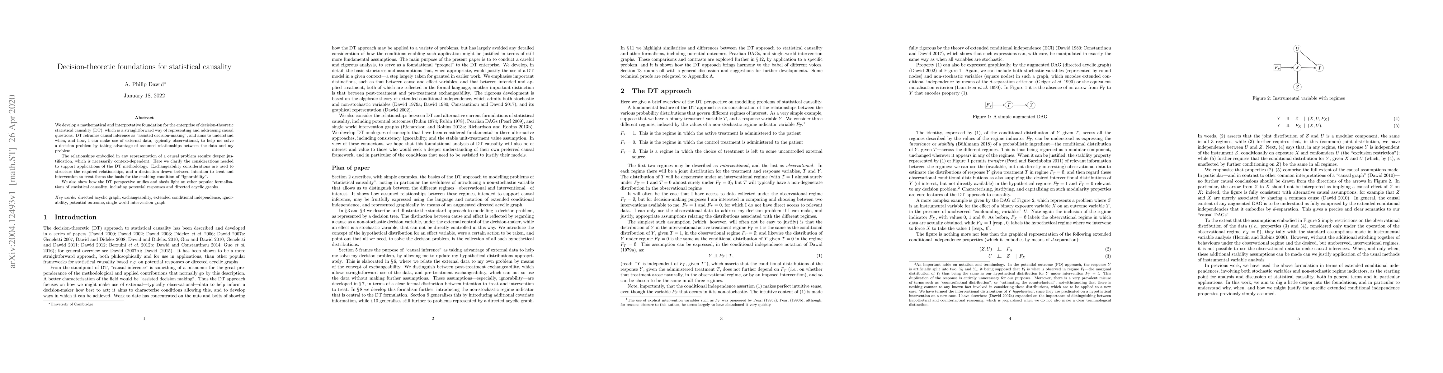We develop a mathematical and interpretative foundation for the enterprise of decision-theoretic statistical causality (DT), which is a straightforward way of representing and addressing causal questions. DT reframes causal inference as "assisted decision-making", and aims to understand when, and how, I can make use of external data, typically observational, to help me solve a decision problem by taking advantage of assumed relationships between the data and my problem. The relationships embodied in any representation of a causal problem require deeper justification, which is necessarily context-dependent. Here we clarify the considerations needed to support applications of the DT methodology. Exchangeability considerations are used to structure the required relationships, and a distinction drawn between intention to treat and intervention to treat forms the basis for the enabling condition of "ignorability". We also show how the DT perspective unifies and sheds light on other popular formalisations of statistical causality, including potential responses and directed acyclic graphs.