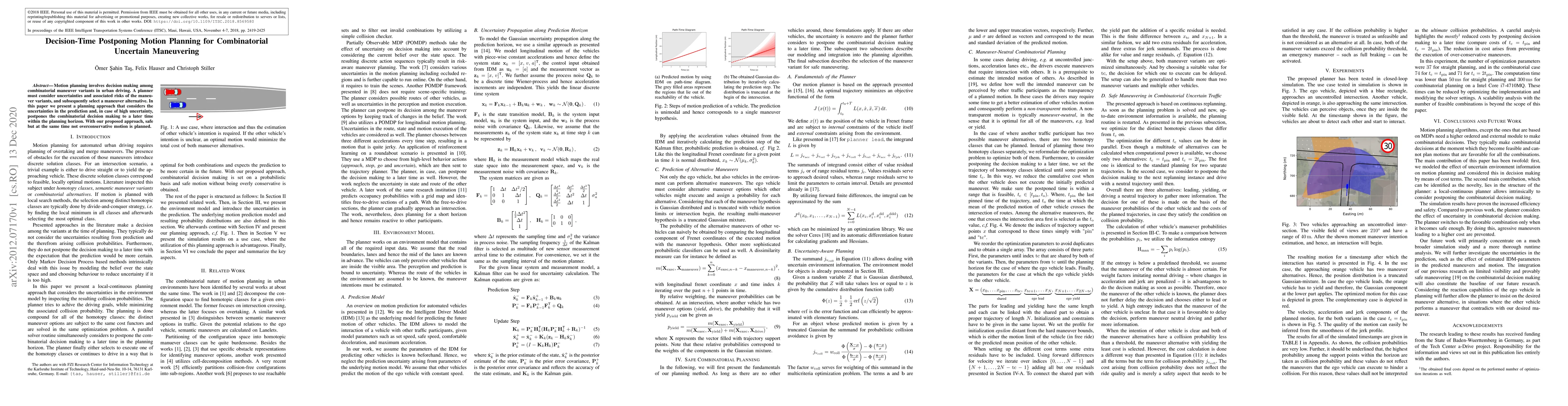 Motion planning involves decision making among combinatorial maneuver variants in urban driving. A planner must consider uncertainties and associated risks of the maneuver variants, and subsequently select a maneuver alternative. In this paper we present a planning approach that considers the uncertainties in the prediction and, in case of high uncertainty, postpones the combinatorial decision making to a later time within the planning horizon. With our proposed approach, safe but at the same time not overconservative motion is planned.