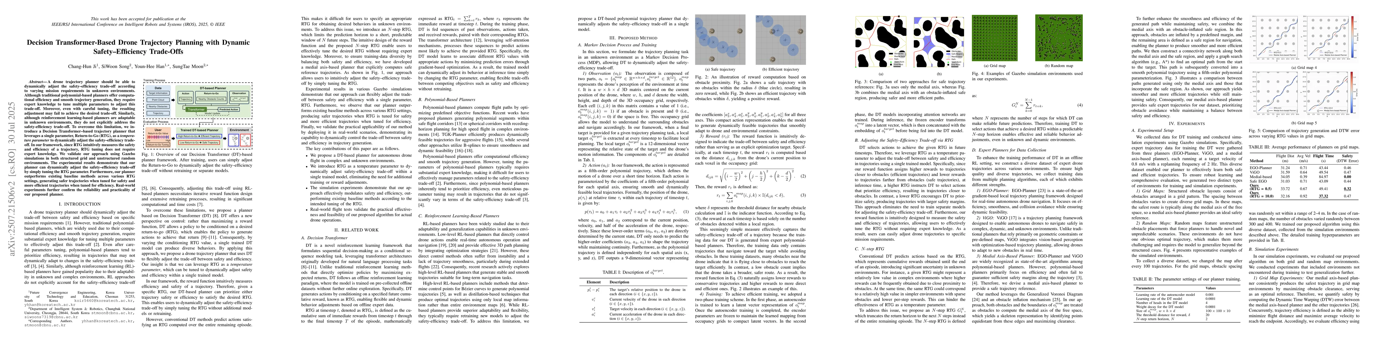 This research introduces a Decision Transformer-based drone trajectory planner that uses a single parameter, Return-to-Go (RTG), to dynamically adjust safety-efficiency trade-offs in unknown environments. Experiments in simulations and real-world tests show this planner outperforms existing methods by generating safer or more efficient trajectories based on RTG tuning, eliminating the need for expert parameter adjustment.