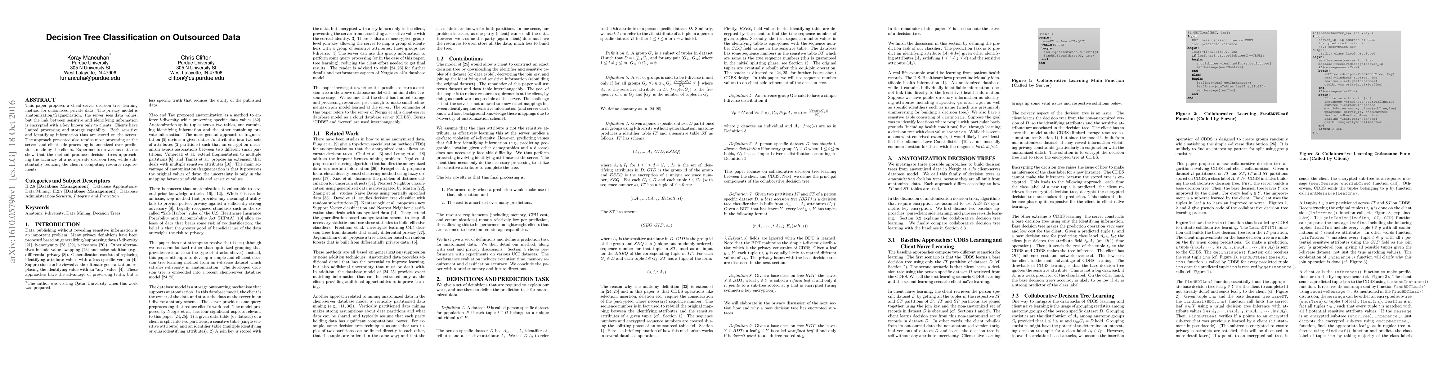 This paper introduces a client-server decision tree learning method for private outsourced data, employing encryption to protect the link between sensitive and identifying information. Experiments demonstrate that the method maintains accuracy while significantly reducing client computing resource needs.