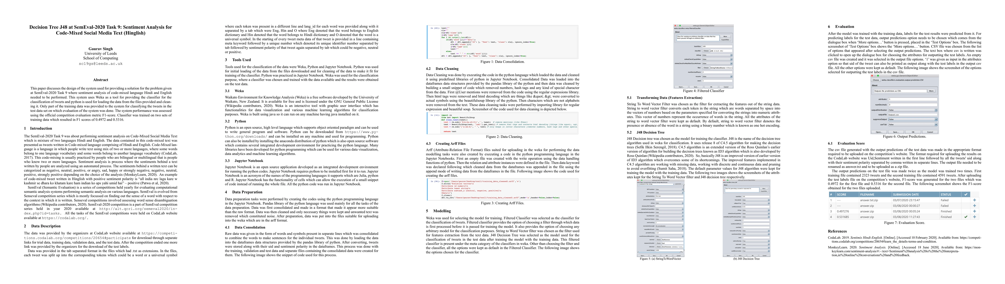 A machine learning system using Weka and Python was developed to analyze sentiment in code-mixed Hindi-English tweets with high F1 scores of 0.4972 and 0.5316.