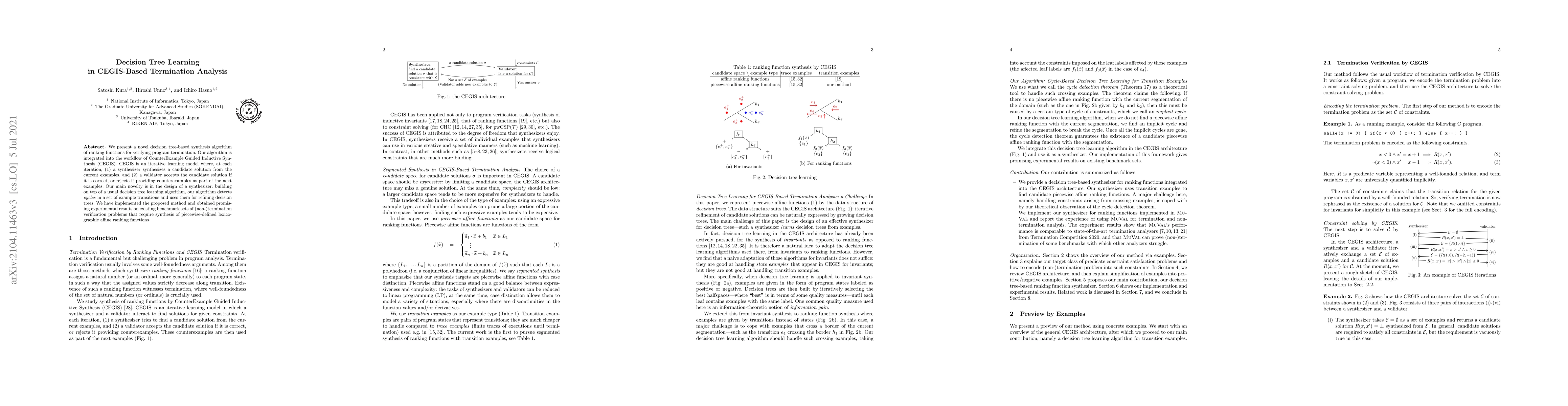 The paper introduces a new decision tree-based algorithm for synthesizing ranking functions to prove program termination, integrated into the CEGIS (CounterExample Guided Inductive Synthesis) framework. The method identifies cycles in example transitions to refine decision trees, demonstrating promising results in experimental verification of termination problems involving piecewise-defined lexicographic affine ranking functions.