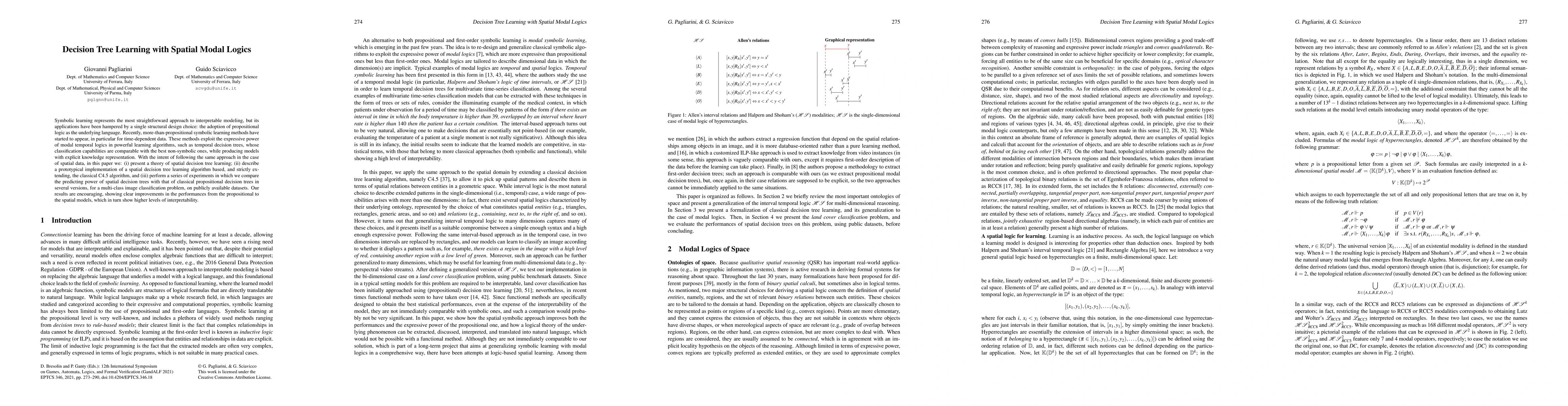 This paper introduces a new theory for spatial decision tree learning using spatial modal logics, extends the classical C4.5 algorithm for this purpose, and demonstrates improved performance and interpretability in spatial decision tree models compared to traditional propositional decision trees in image classification tasks.